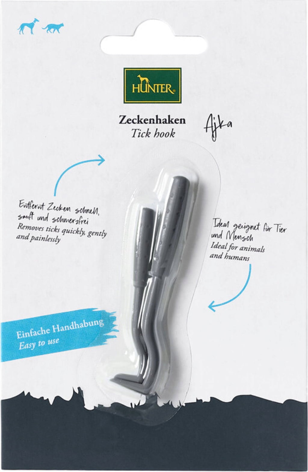 Les tiques sont actives dès 7 °C de température. Cela signifie qu'elles peuvent être un fléau toute l'année. Si votre animal de compagnie a attrapé un ou plusieurs de ces parasites, une élimination professionnelle s'impose ! Rien de plus facile avec le crochet à tiques Ajka de HUNTER ! Cet outil pratique s'utilise sur les chiens, les chats, mais aussi sur les humains.
