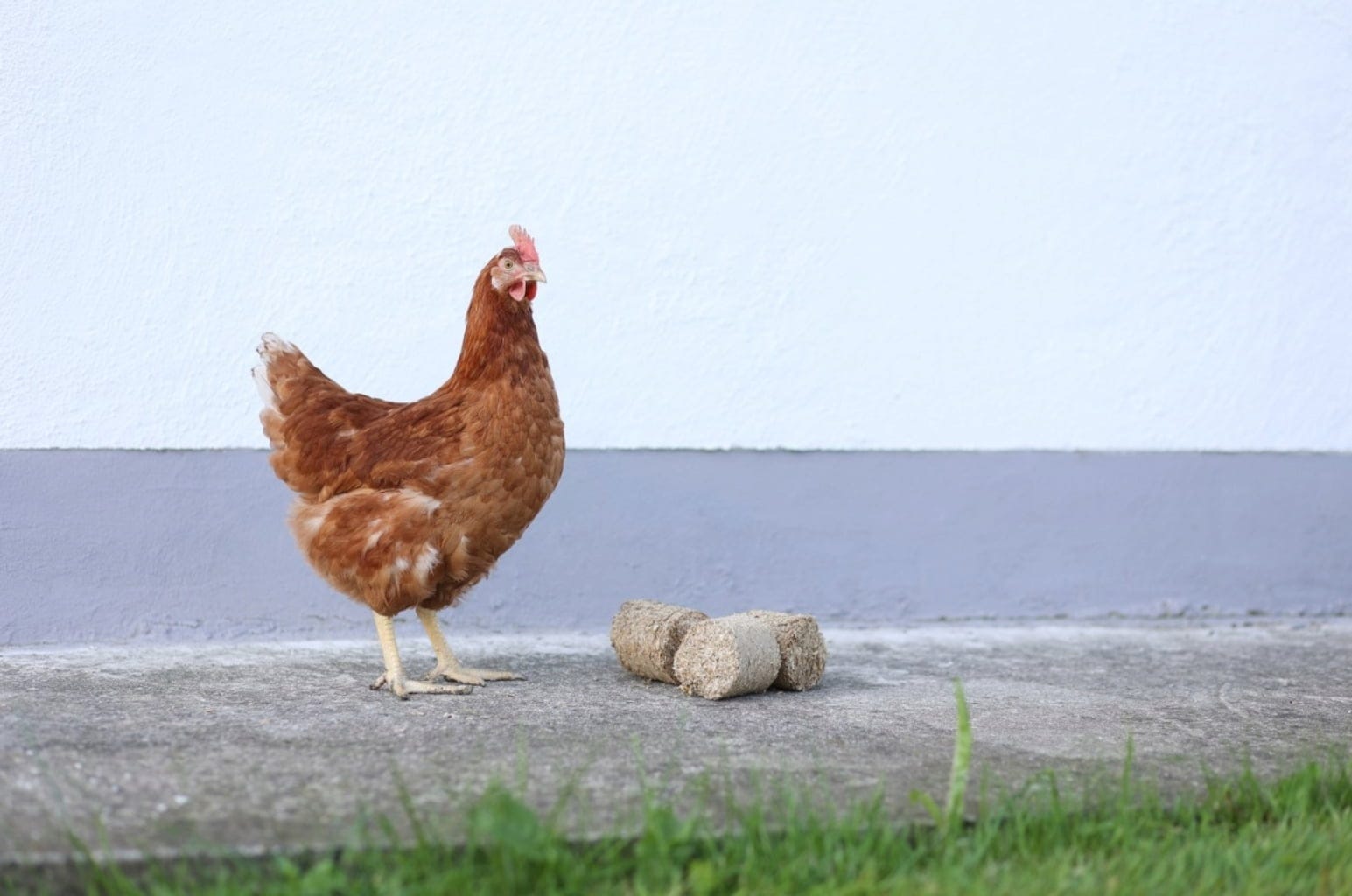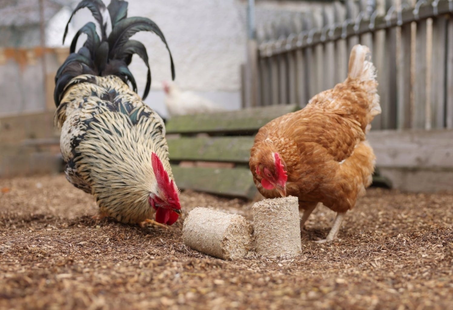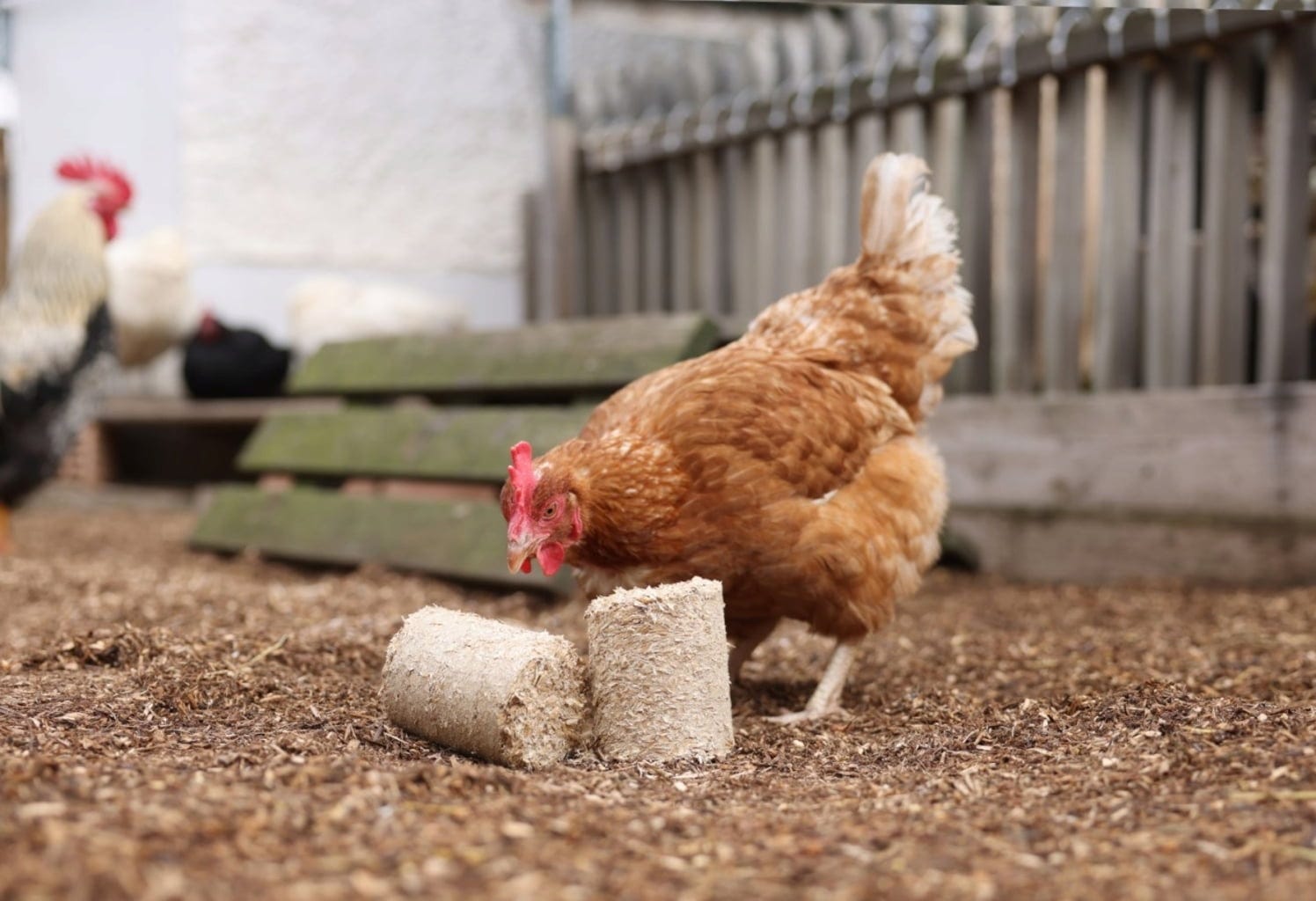 - Une fois picorés, les briquettes se désagrègent et se transforment en litière absorbante – pour plus d’hygiène et de bien-être dans le poulailler