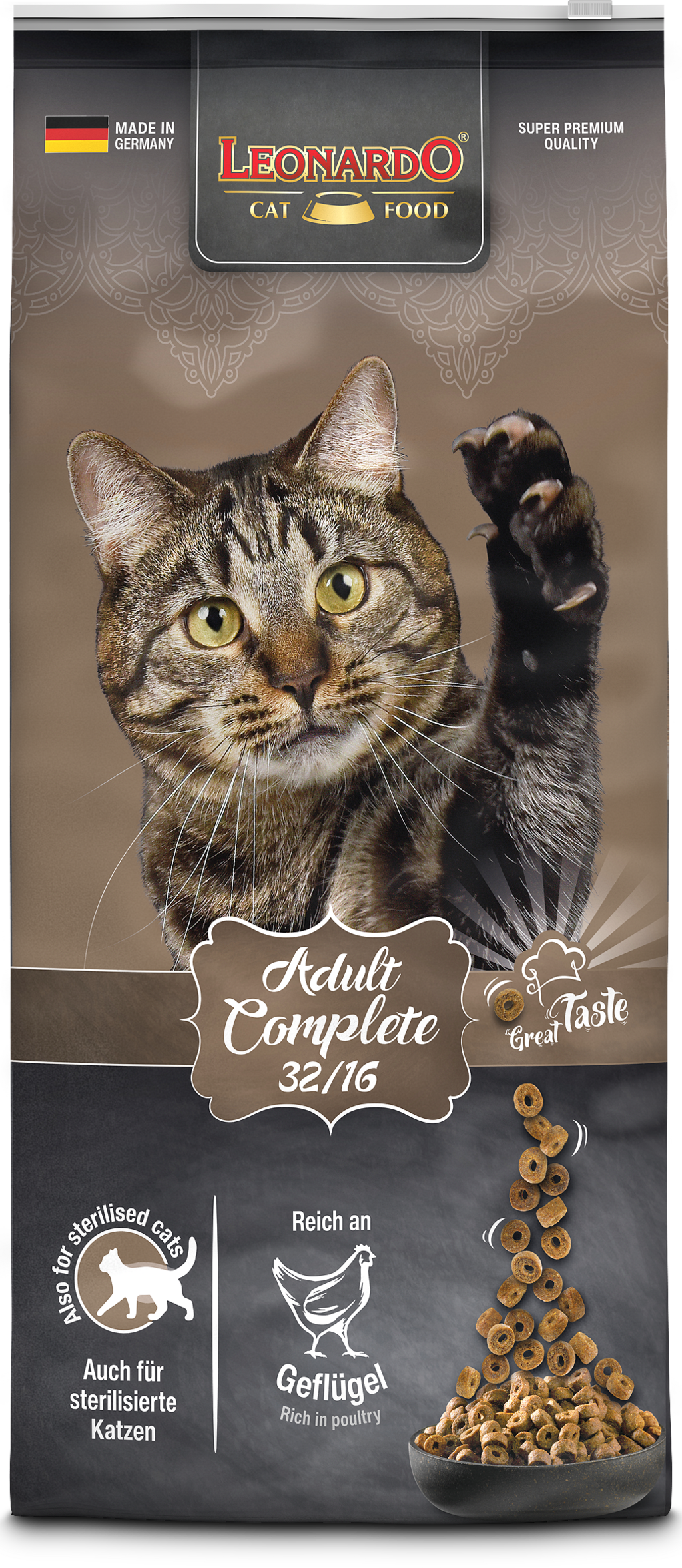 Les croquettes Adult Complete 32/16 conviennent parfaitement aux chats peu actifs grâce à leur faible teneur énergétique (16 %). Convient également aux chats stérilisés. Avec de la volaille extra-fraîche, des graines de lin, de la levure de bière et du malt.