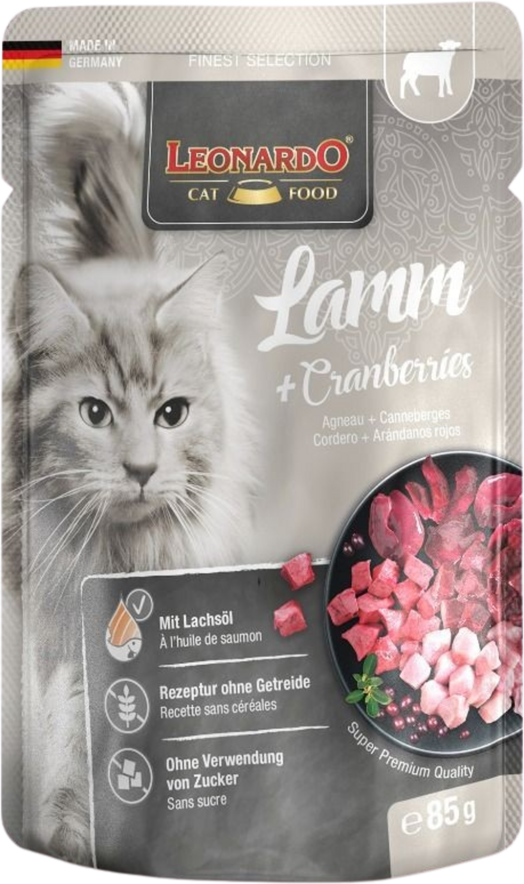 La viande juteuse et les abats savoureux d'agneau et de volaille sont agrémentés de canneberges délicieuses et transforment chaque repas en un véritable délice ! Les ingrédients soigneusement sélectionnés sont cuits en sachets et agrémentés d'une précieuse huile de saumon. Le rêve pour tous les chats !