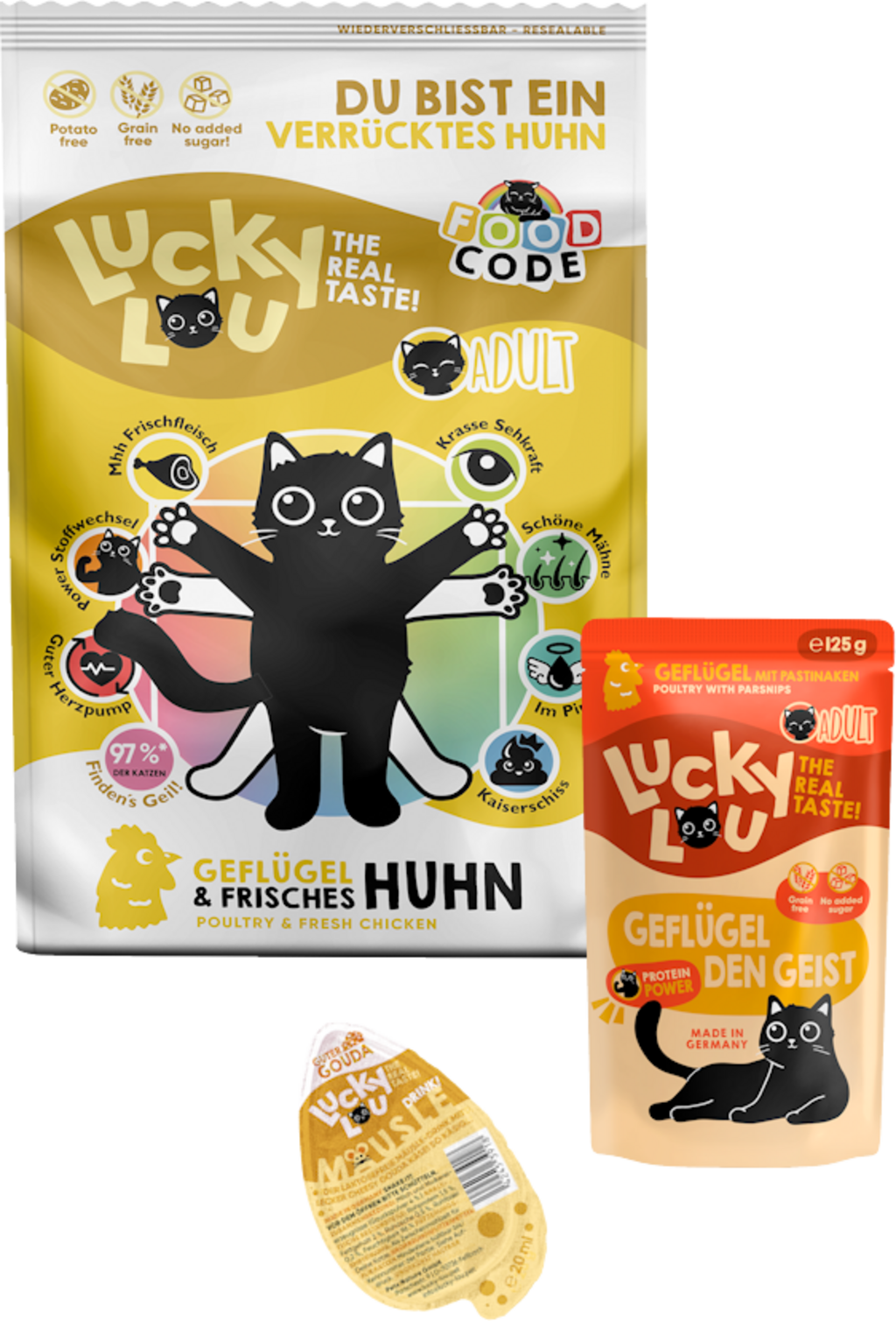 - Remplie de croquettes Food Code Life Stage Adult Volaille & Poulet 750 g, alimentation humide Life Stage Adult Volaille 125 g, boisson-snack Mäusle Gouda 20 ml
