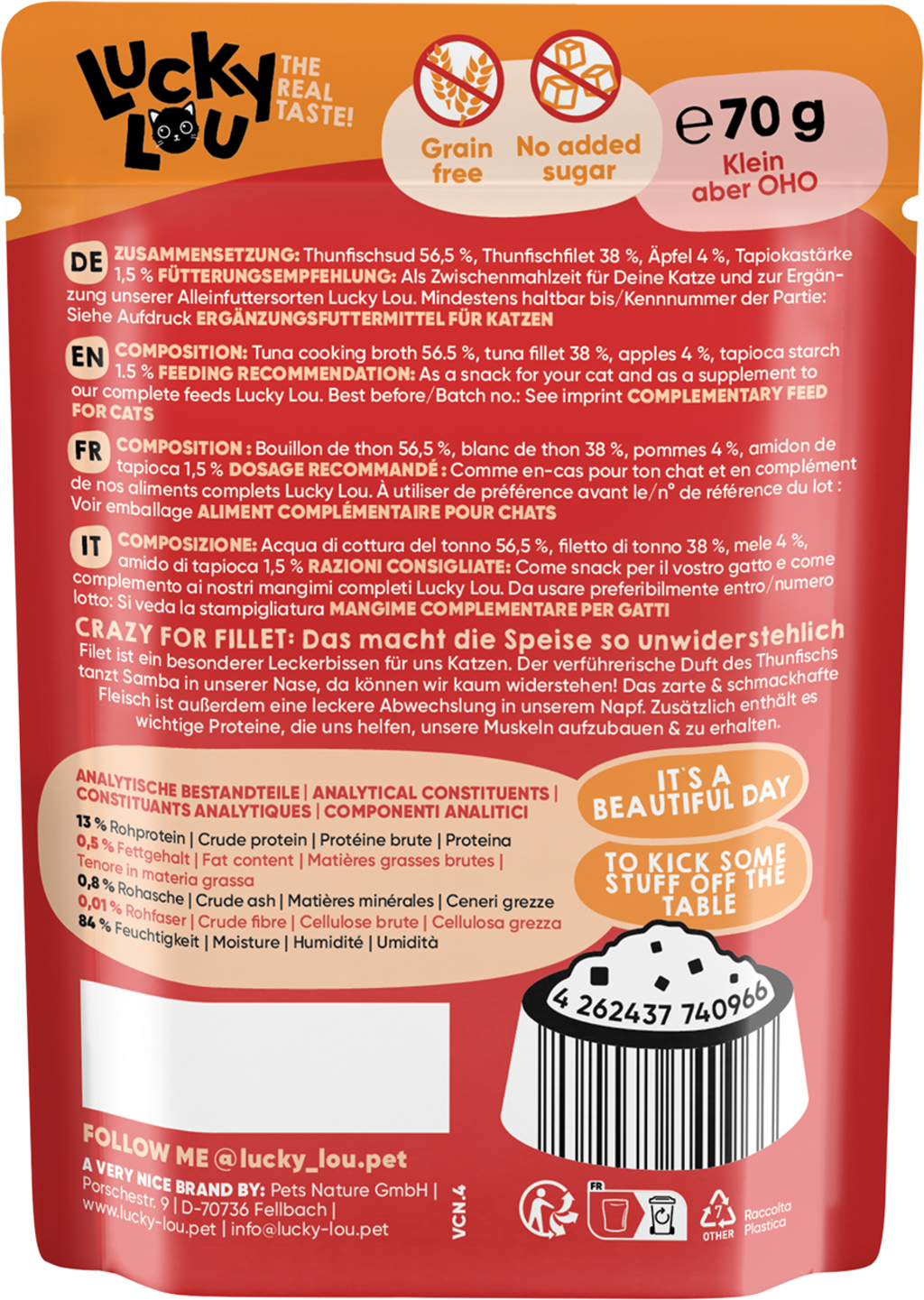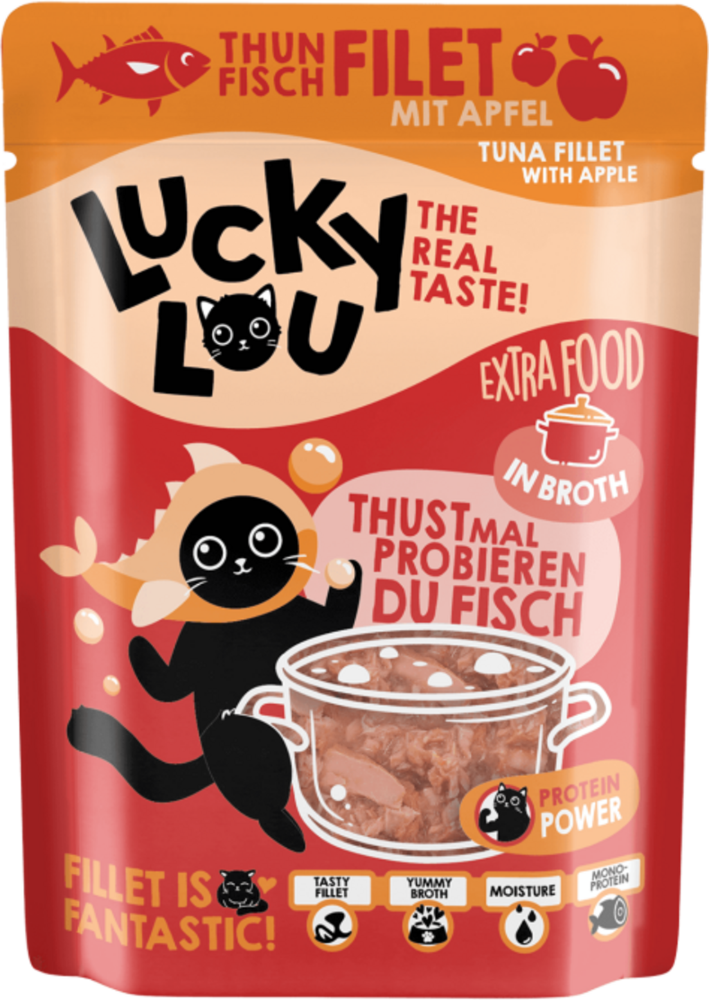 avis en français à propos du produit Lucky Lou Extra Food Pouch - Thon à la Pomme dans Bouillon, Sachet