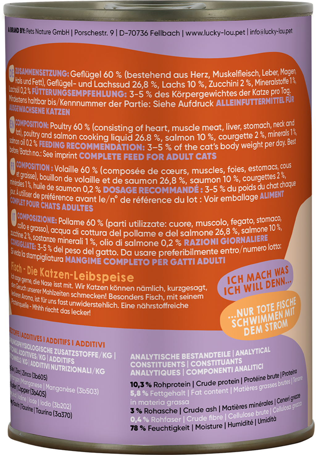 60 % volaille (cœur, muscle, foie, estomac, cou, graisse), 26,8 % Geflügel- und Lachssud, 10 % poisson, 2 % courgette, 1 % Mineralstoffe, 0,2 % huile de saumon