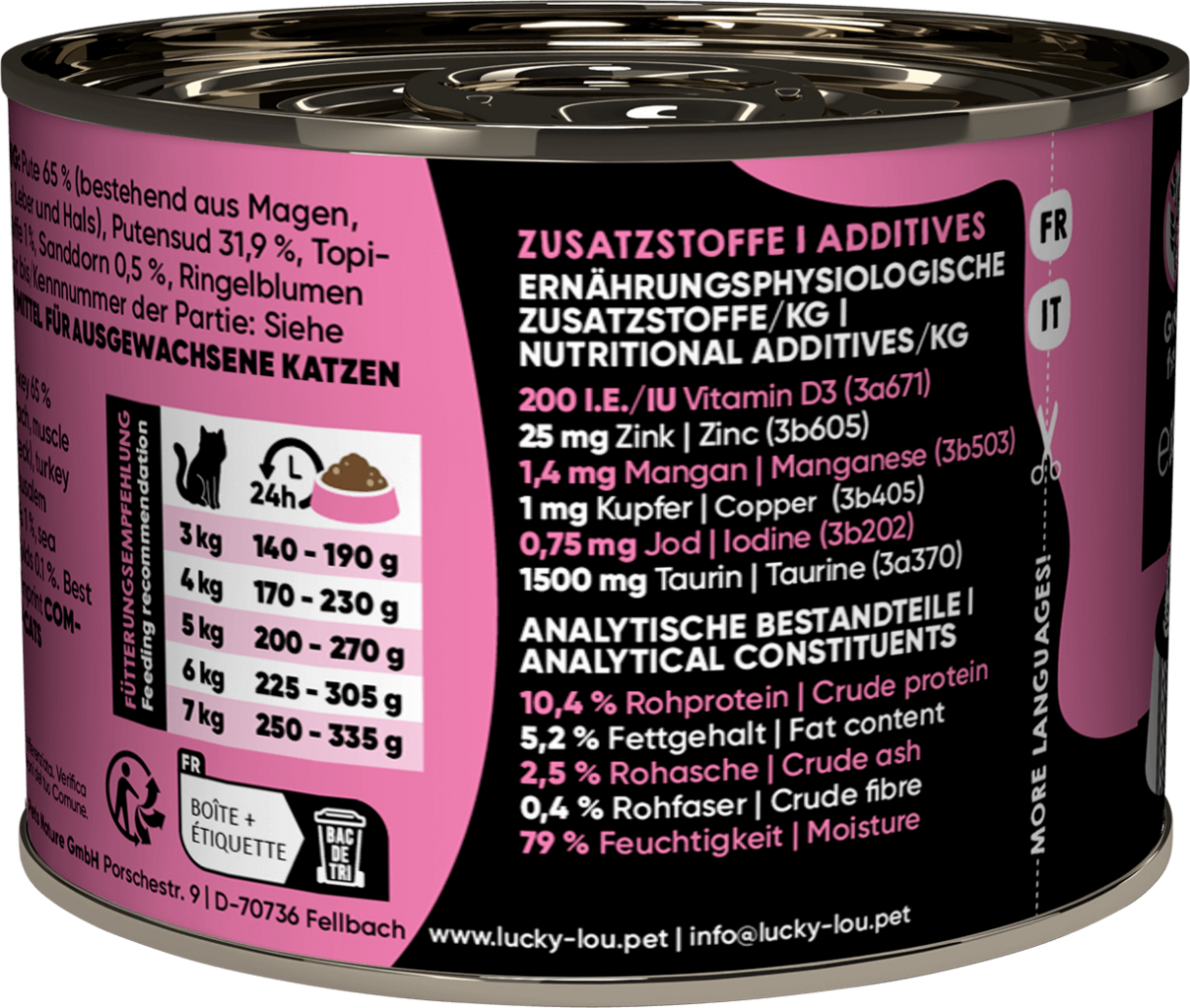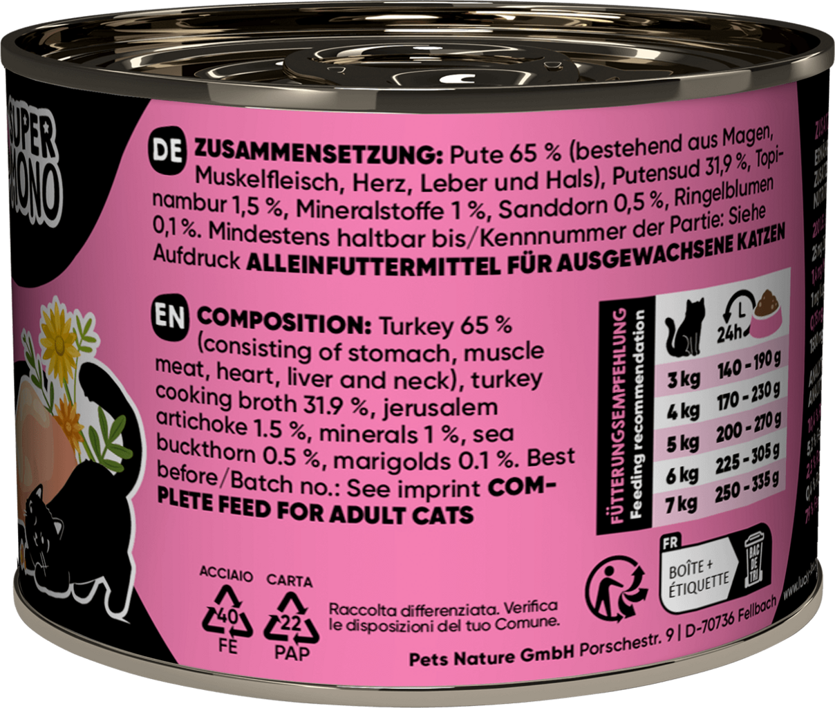 65 % dinde (estomac, muscle, cœur, foie, cou), 31,9 % bouillon de dinde, 1,5 % topinambour , 1 % Mineralstoffe, 0,5 % argousier, 0,1 % œillets d'Inde