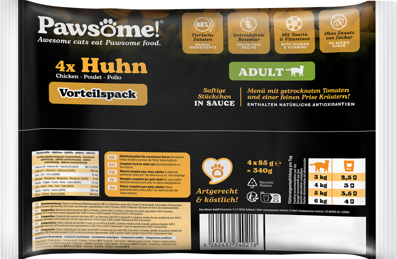La pâtée Pawesome! avec de succulents morceaux de viande et une sauce savoureuse ravira même les chats les plus exigeants. Cet aliment complet délicieux est élaboré à partir d’ingrédients naturels, spécifiquement adaptés à chaque phase de la vie de l’animal. Des superaliments sélectionnés assurent à votre compagnon un apport optimal en vitamines et en nutriments essentiels.
