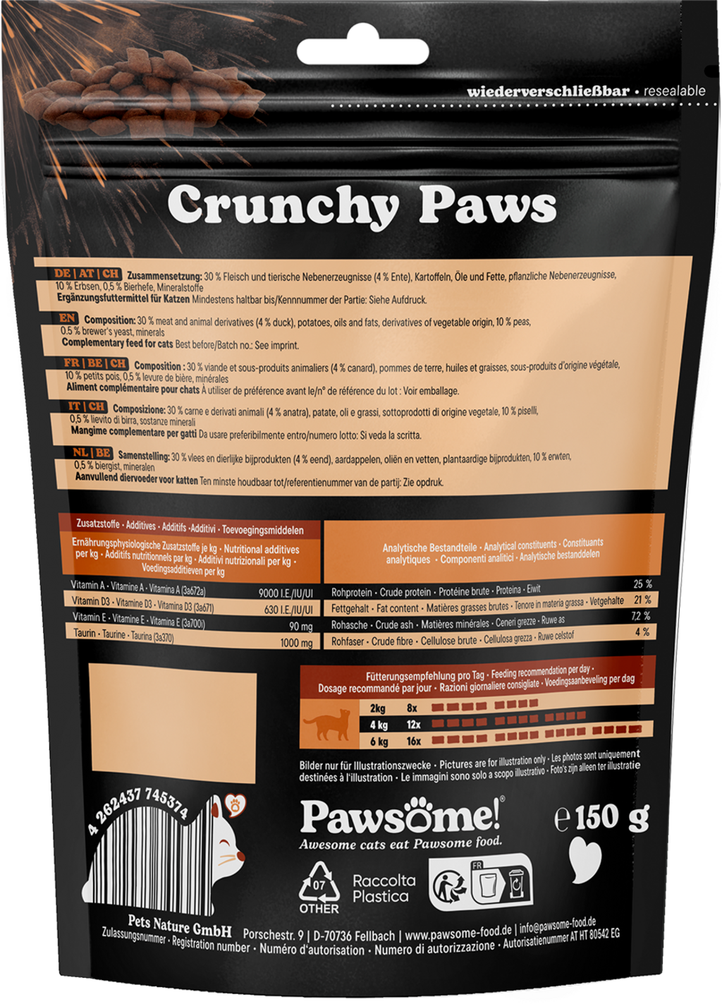 Avec Paws de Pawsome!, chaque pause gourmande devient un véritable moment de plaisir. Ces snacks croustillants au délicieux cœur fondant sont entièrement sans céréales et sans sucre. La taurine, les vitamines, la levure de bière comme source naturelle de vitamines du groupe B et l’herbe à chat garantissent une friandise vraiment spéciale.