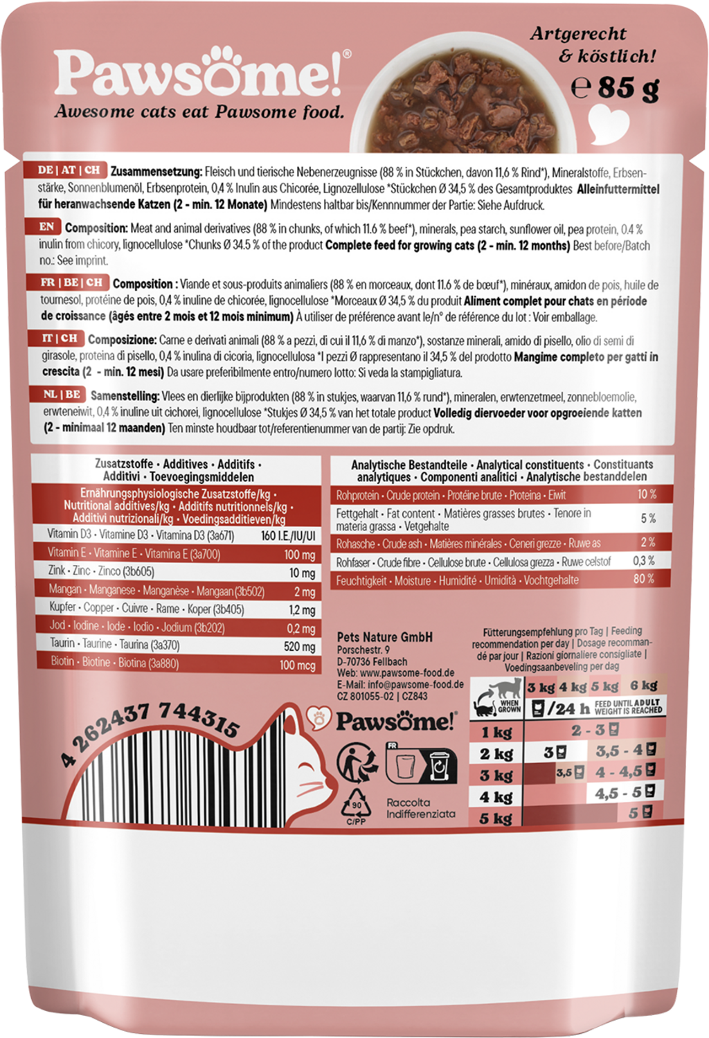 Pawesome ! Cette nourriture humide composée de tendres morceaux de viande dans une délicieuse sauce convaincra même les chats les plus exigeants. Cet aliment complet mise sur des ingrédients naturels adaptés à chaque phase de vie. Des superfoods soigneusement sélectionnés apportent à votre compagnon de précieux vitamines et nutriments essentiels.