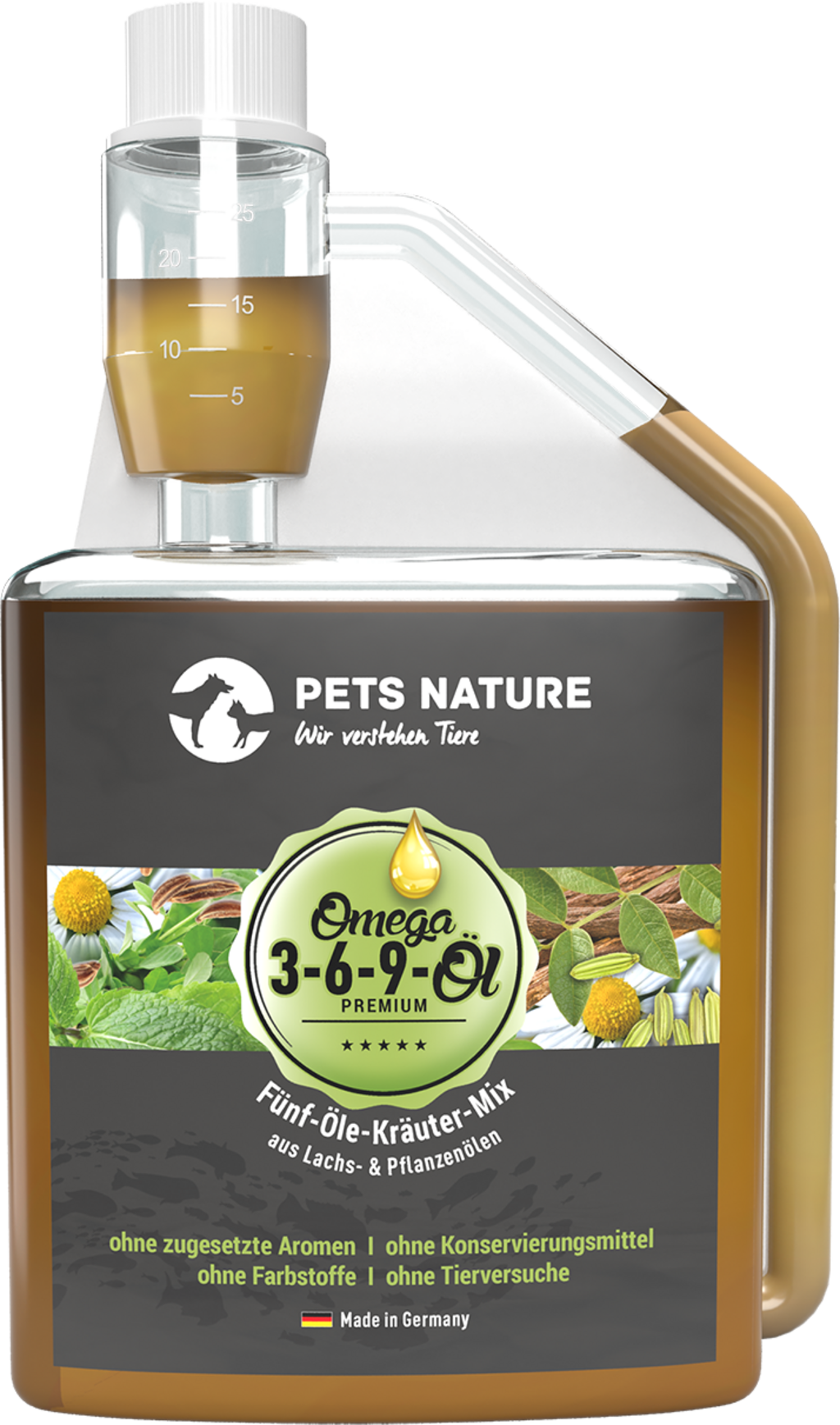 39,5 % huile de carthame, 20 % huile de chanvre, 20 % huile de saumon, 10 % Chiaöl, 10 % Leinöl, 0,5 % Herbes aromatiques (feuilles de menthe poivrée, Kümmelfrucht, Fenugrec, Racine de réglisse, Racine de curcuma, Fenchelsamen, fleurs de camomille)