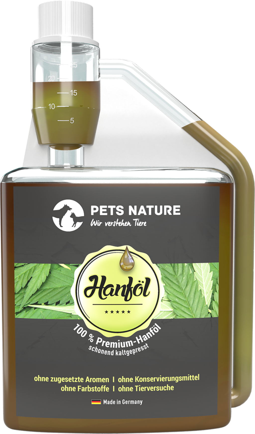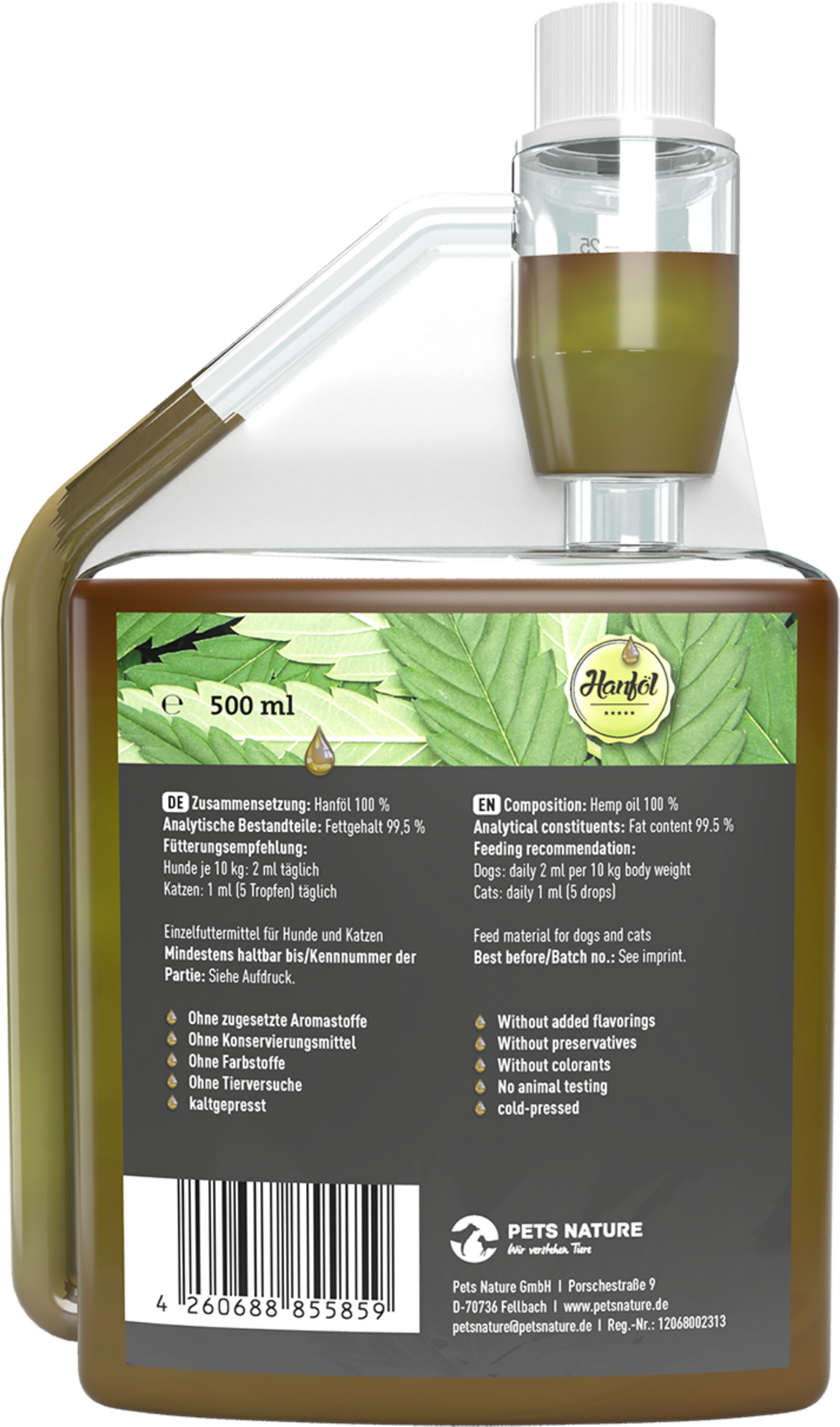Cette huile de chanvre pure fournit à votre chien ou à votre chat de précieuses acides gras insaturés oméga 3 et oméga 6 et constitue ainsi un complément de qualité à l’aliment principal quotidien de votre animal de compagnie.