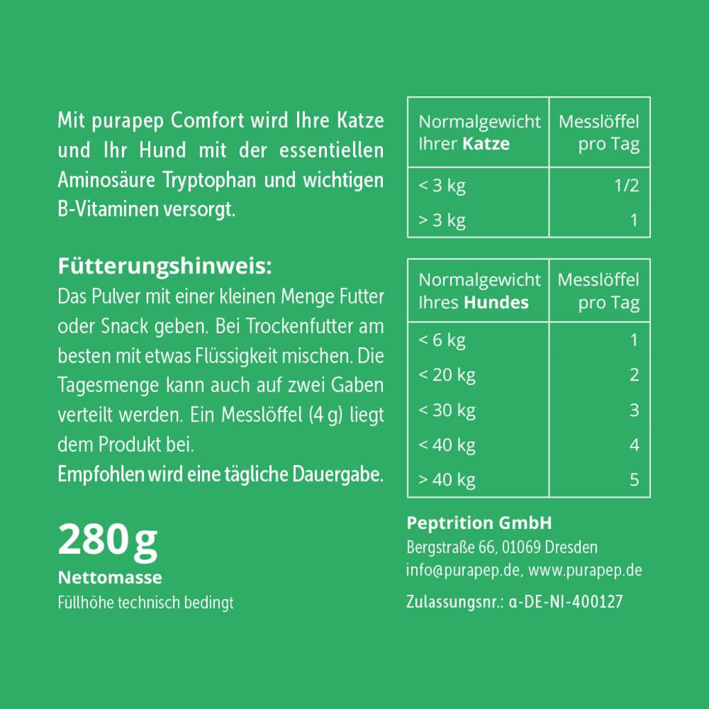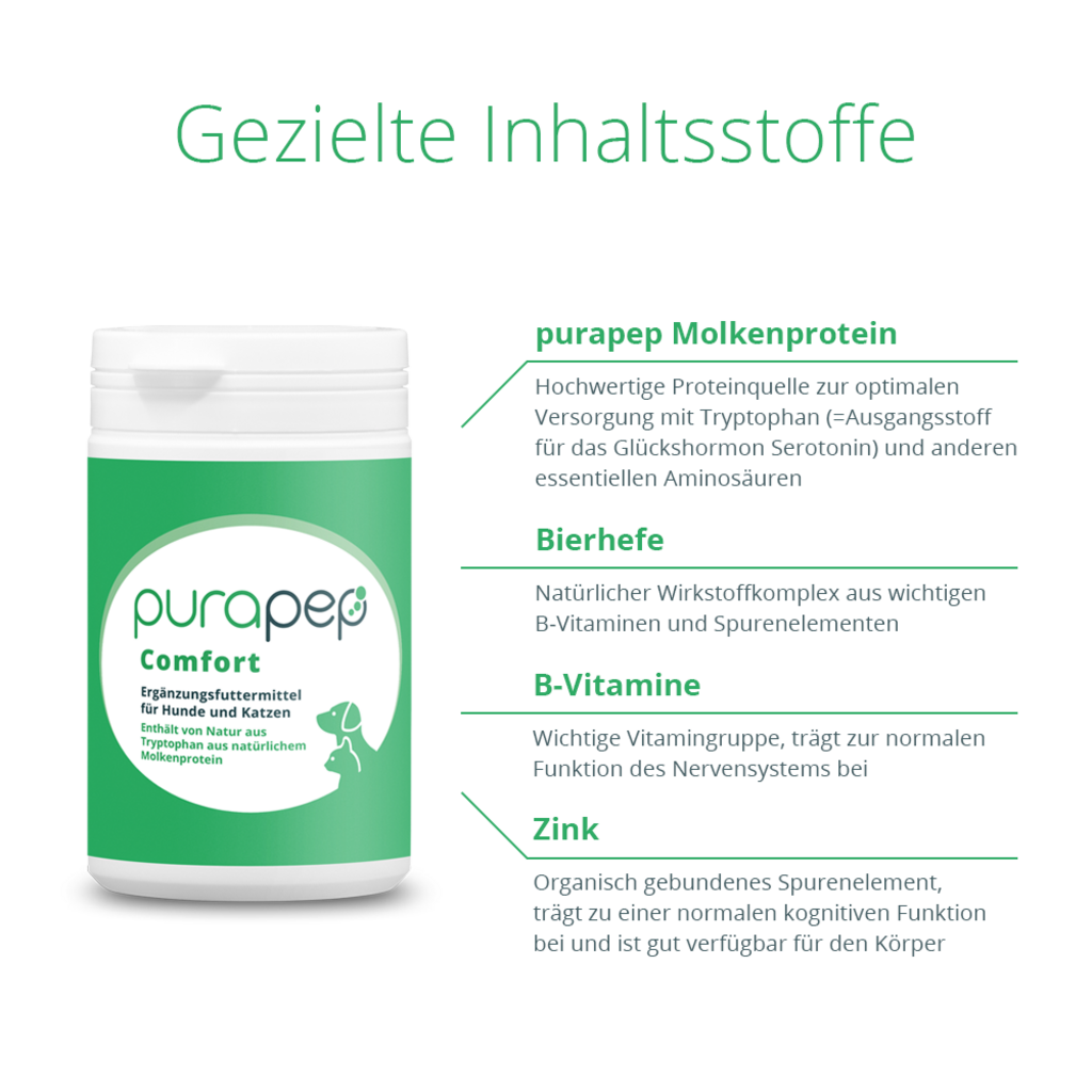 - purapep Comfort contient des protéines de lactosérum et de la levure de bière. En cas d’allergie à l’un de ces ingrédients, purapep Comfort ne doit pas être administré.
