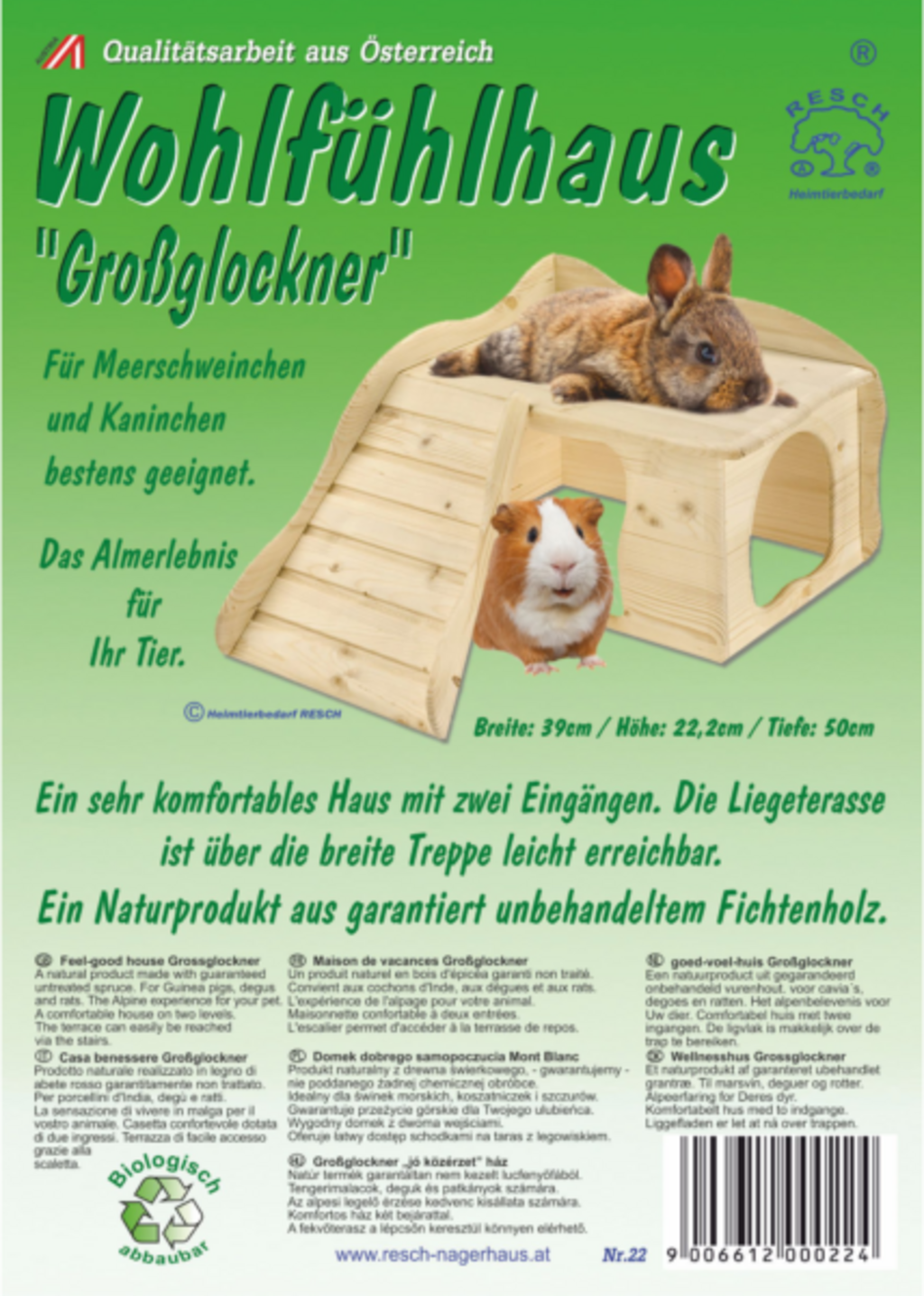 RESCH est une entreprise artisanale autrichienne qui s'est spécialisée dans la fabrication de maisonnettes robustes pour rongeurs de différentes tailles. Tous les modèles ont en commun le choix des matériaux : du bois d'épicéa massif non traité, de la colle inoffensive et des clous minuscules (utilisés avec parcimonie et travaillés avec soin) garantissent le bonheur des rongeurs sans aucun risque.