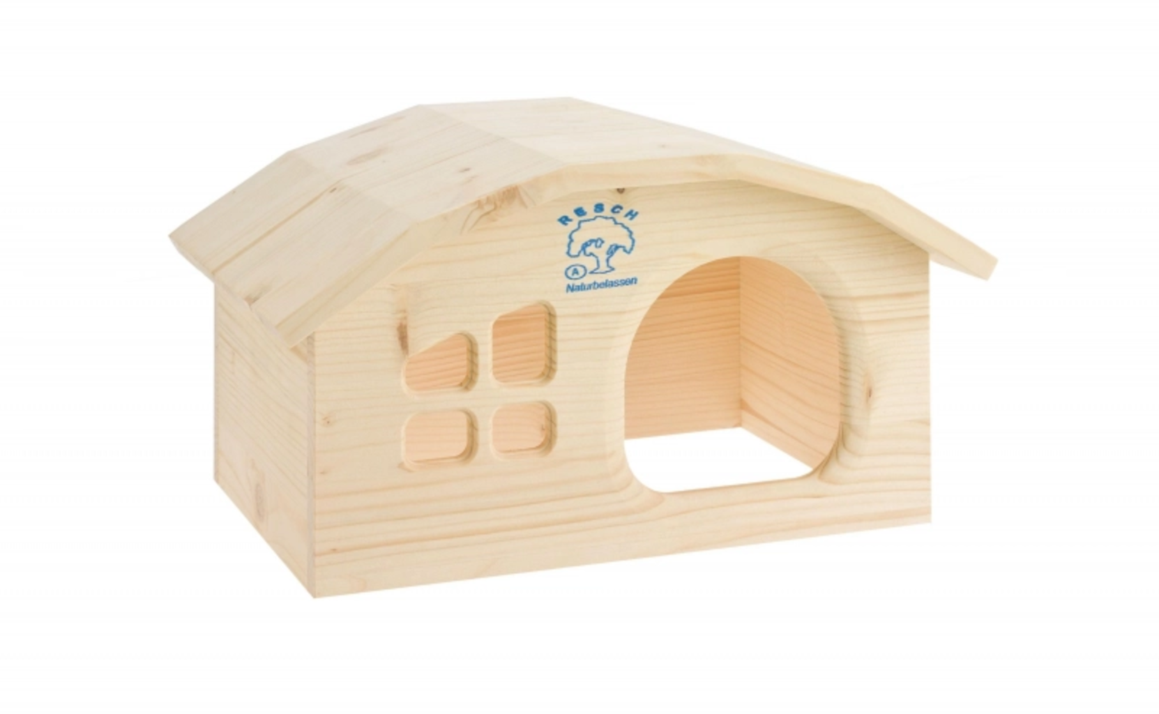 Cette charmante maisonnette de Resch est entièrement fabriquée à la main en bois massif d'épicéa. Idéale pour les petits rongeurs, elle est extrêmement confortable et offre beaucoup d'espace pour toutes les activités de vos animaux. Les portes et fenêtres présentent des formes organiques et les coins sont arrondis.