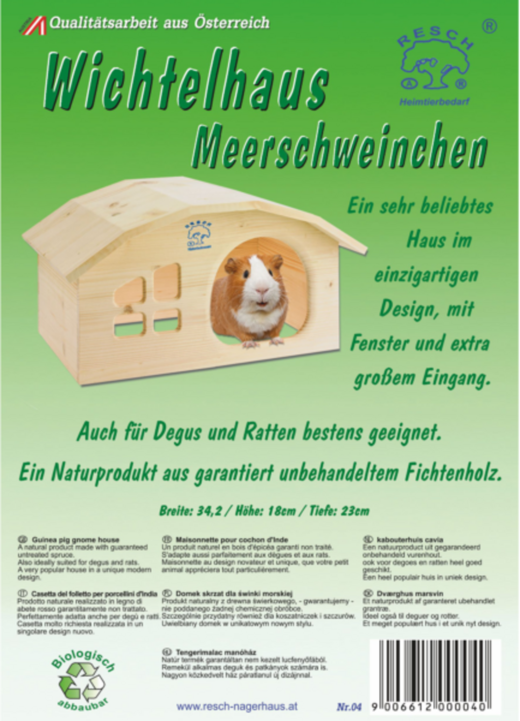 RESCH est une entreprise artisanale autrichienne qui s'est spécialisée dans la fabrication de maisonnettes robustes pour rongeurs de différentes tailles. Tous les modèles ont en commun le choix des matériaux : du bois d'épicéa massif non traité, de la colle inoffensive et des clous minuscules (utilisés avec parcimonie et travaillés avec soin) garantissent le bonheur des rongeurs sans aucun risque.