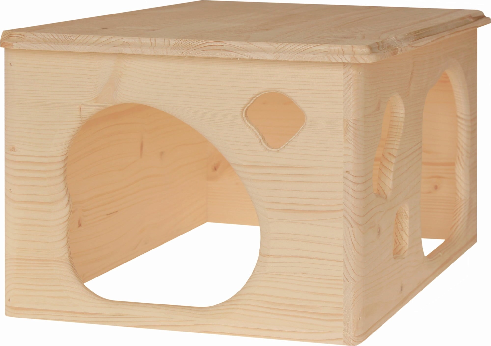Un terrier confortable, fabriqué dans une entreprise artisanale en bois massif d'épicéa naturel. Il offre suffisamment d'espace pour se reposer, manger et observer l'environnement. Les ouvertures de forme organique laissent pénétrer beaucoup d'air et de lumière à l'intérieur, et votre rongeur ne se sent jamais à l'étroit, tout en étant confortablement protégé.
