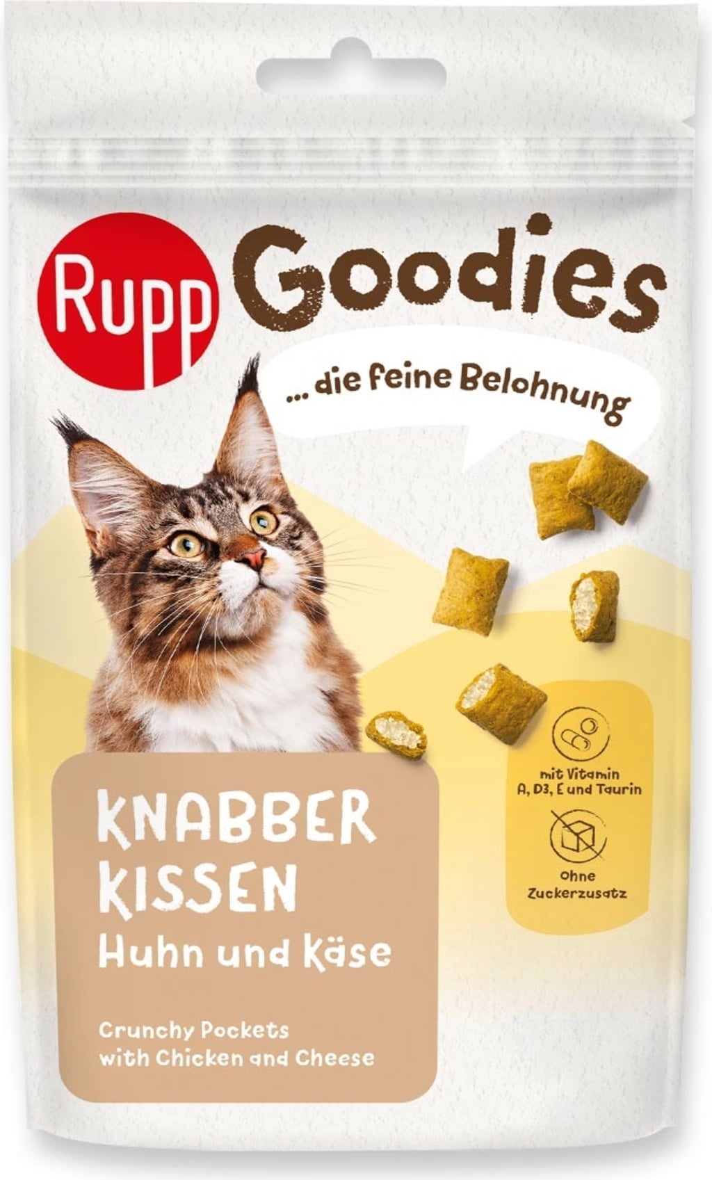 Offrez à votre chat des notes irrésistiblement savoureuses de poulet tendre et de fromage goûtu dans les coussins à grignoter de Rupp. Des friandises riches en précieuses vitamines A, D3 et E ainsi qu'en taurine pour votre félin ! Sans sucre ajouté !