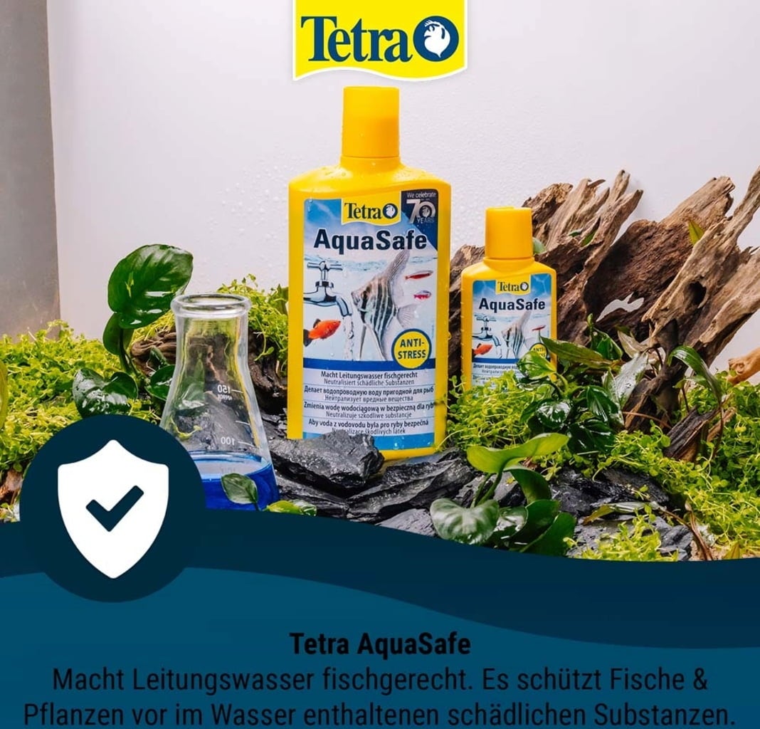 Tetra AquaSafe est un conditionneur d'eau pour aquariums d'eau douce et d'eau de mer qui neutralise les substances nocives et rend l'eau du robinet adaptée aux poissons.