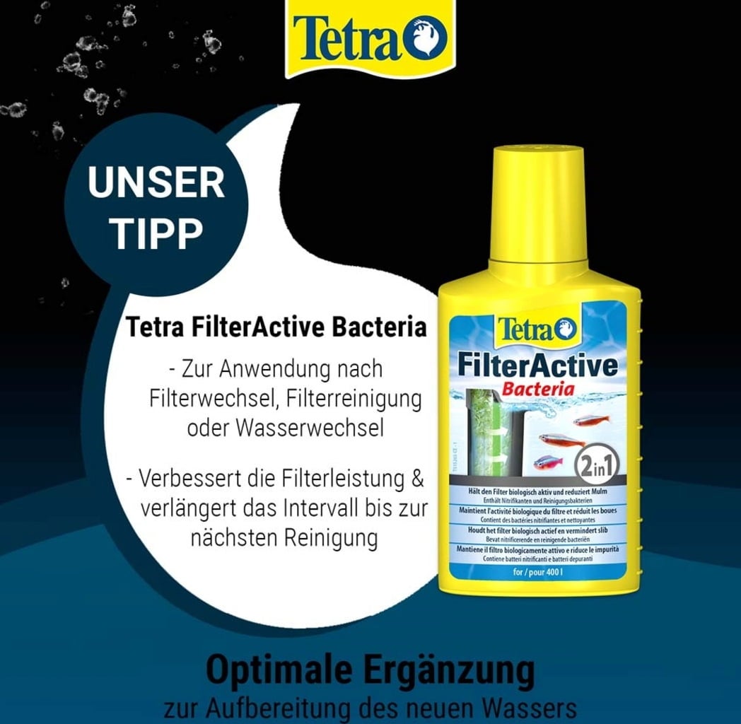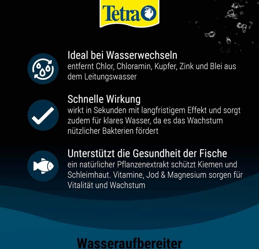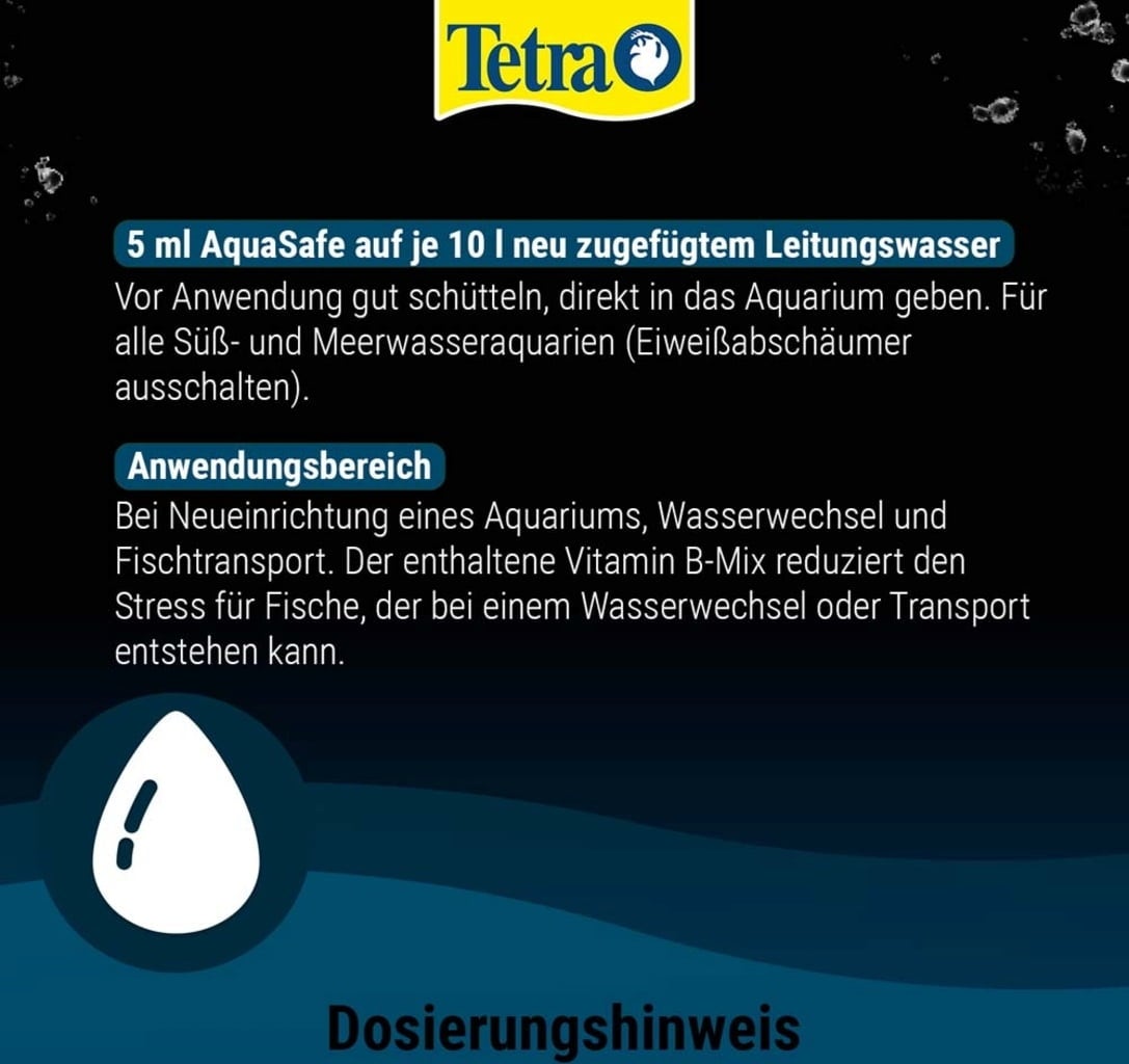 Tera AquaSafe protège les poissons et les plantes des substances nocives dans l'eau du robinet et ajoute des substances vitales importantes pour une eau d'aquarium quasi naturelle. La formule optimisée est parfaitement adaptée aux besoins de soins de la peau et des nageoires de vos poissons. Le conditionneur d'eau neutralise instantanément le chlore dangereux, la chloramine, le cuivre, le zinc et le plomb. Les branchies et les muqueuses des poissons sont protégées et les vitamines B réduisent le stress. Tetra AquaSafe favorise la vitalité, la croissance et le bien-être grâce à l'ajout d'iode et de magnésium et assure une eau claire en favorisant la croissance de bactéries bénéfiques.