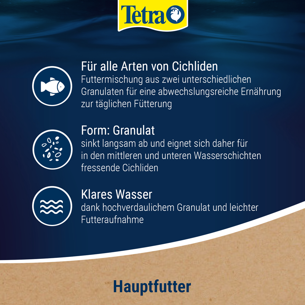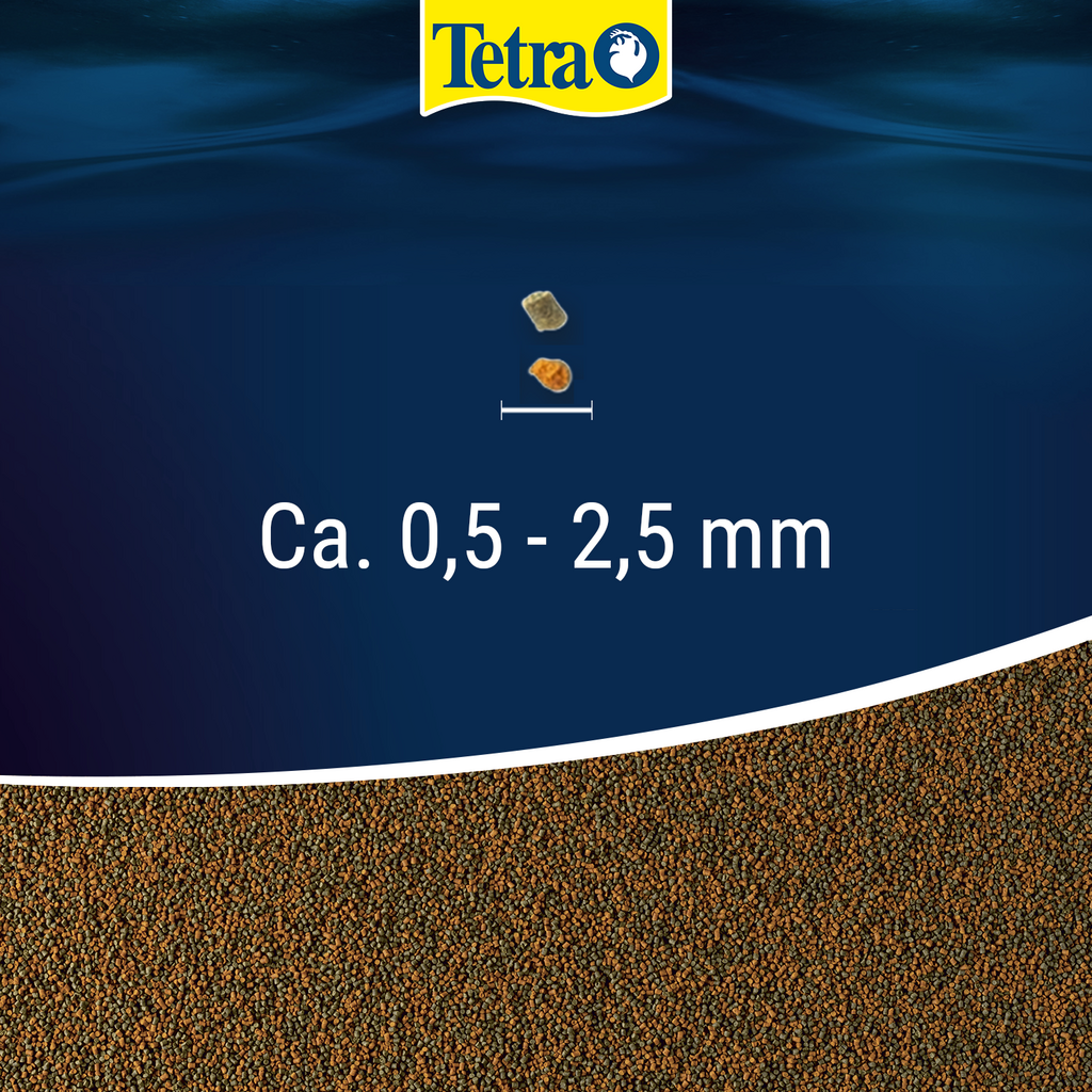 Tetra Cichlid Granules offre à vos cichlidés une alimentation équilibrée et saine. Grâce à la combinaison de deux types de granulés différents, il permet de nourrir une grande variété de cichlidés avec une alimentation diversifiée. Ces granulés, qui descendent lentement dans l'eau, sont particulièrement adaptés aux cichlidés qui se nourrissent dans les couches d'eau moyennes et inférieures.