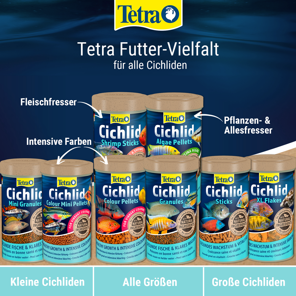 Avec Tetra Cichlid Granules, tous les types de cichlidés bénéficient d'une alimentation saine et équilibrée grâce aux deux granulés différents.