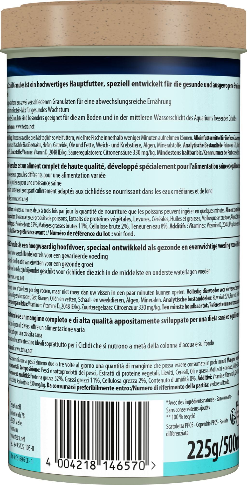 La recette, élaborée à partir d'ingrédients naturels de haute qualité, ne contient ni colorants ni conservateurs ajoutés. Grâce à un mélange de protéines parfaitement équilibré, elle soutient une croissance saine et renforce la résistance des poissons. De plus, les Tetra Cichlid Granules favorisent une eau propre et une excellente qualité de l'eau grâce à leur haute digestibilité.