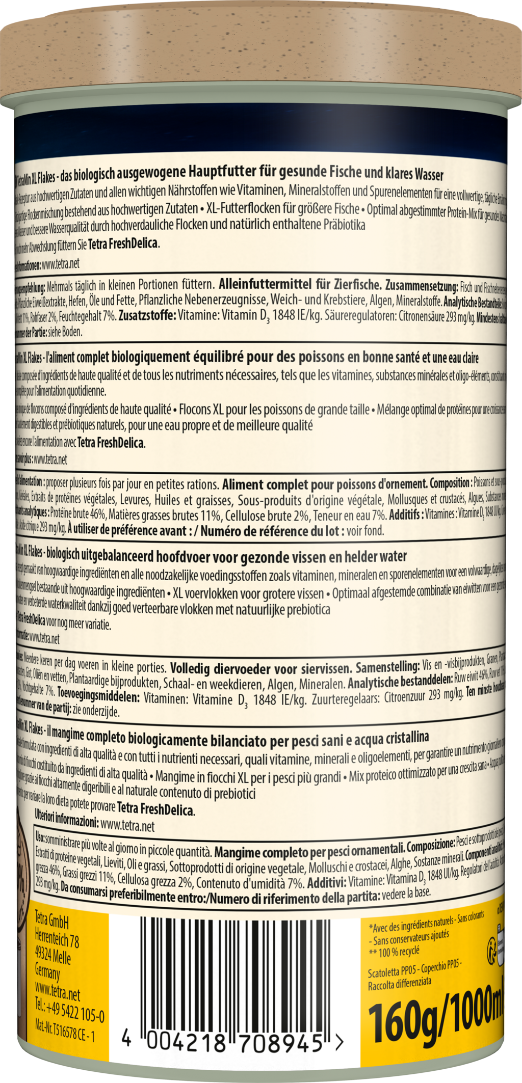 Avec sa formulation de qualité supérieure, incluant des ingrédients naturels, un mélange spécial de protéines, la formule BioActive et des prébiotiques, TetraMin XL Flakes soutient la vitalité des poissons et leur système immunitaire, sans ajout de colorants ni de conservateurs. Sa haute digestibilité garantit également une eau propre plus longtemps.