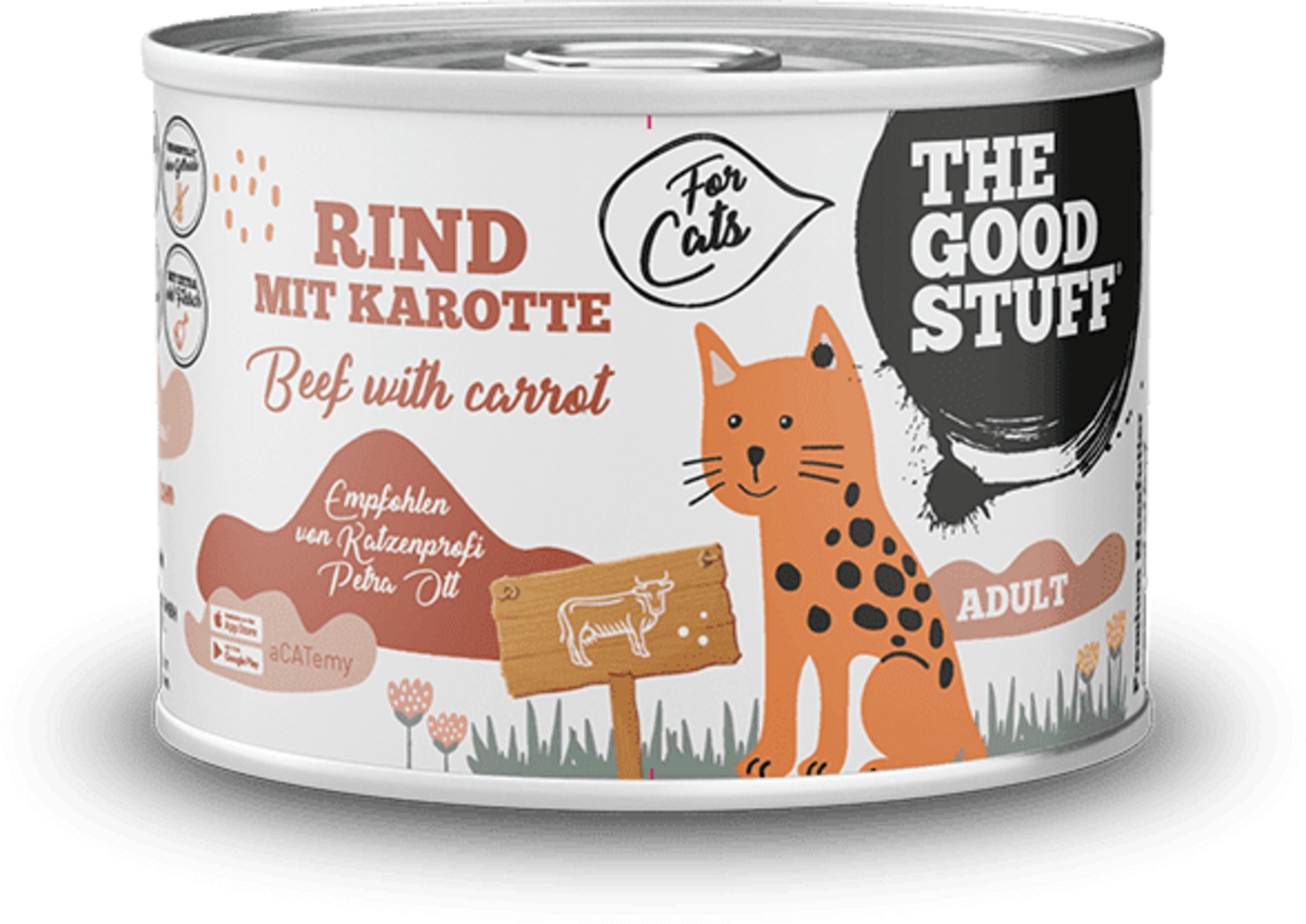 S'il y a une chose à laquelle les chats sont fidèles, c'est leur réputation de gourmets, c'est pourquoi The Goodstuff se concentre sur l'essentiel dans ses recettes alimentaires. Dans cette recette, 70% de viande de muscle et d'abats sont combinés avec des nutriments sélectionnés à base de carottes. Afin de maintenir le naturel absolu et un excellent goût, les morceaux de viande et les carottes sont conservés dans leur propre jus, sans aucun autre conservateur, colorant ou arôme. Sans aucune céréale.