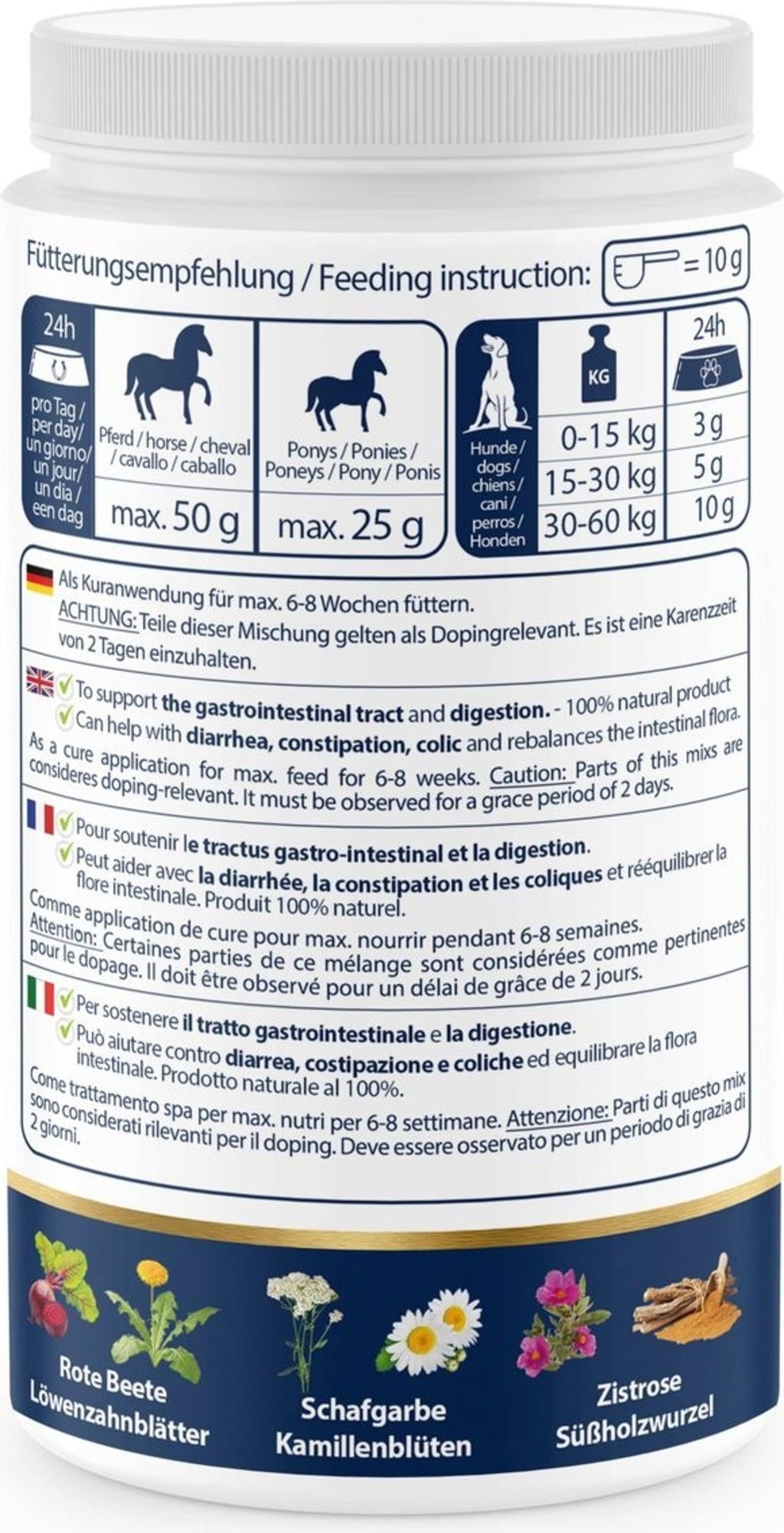 Cette poudre végétale a été créée pour renforcer le système gastro-intestinal des animaux. Elle peut aider en cas d'ulcères de l'estomac et d'inflammations de la muqueuse gastrique (gastrite), mais aussi en cas de constipation ou de diarrhée et de crottins liquides. Elle contient des herbes qui peuvent aider à atténuer la mauvaise haleine, les brûlures d'estomac et les douleurs de gastrite.