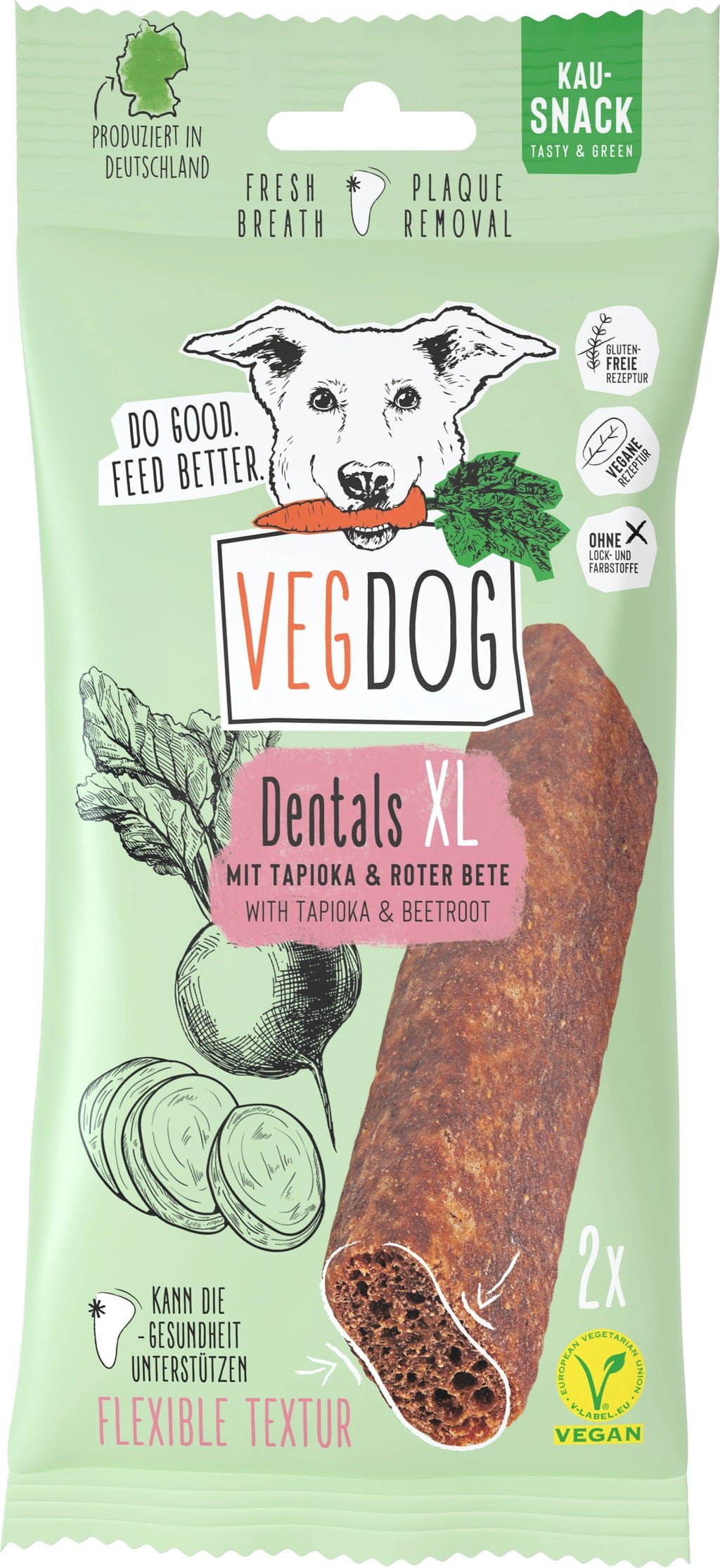 Une alternative végane aux os ? C'est possible avec VEGDOG ! Les savoureux DENTALS XL à la texture spongieuse offrent un goût irrésistible de betterave et une bonne portion de précieuse vitamine C ! Les chiens sont pleinement convaincus par leur saveur et leur fermeté. En mâchant, la mâchoires et les dents sont mises à contribution, contribuant durablement à l'hygiène bucco-dentaire !
