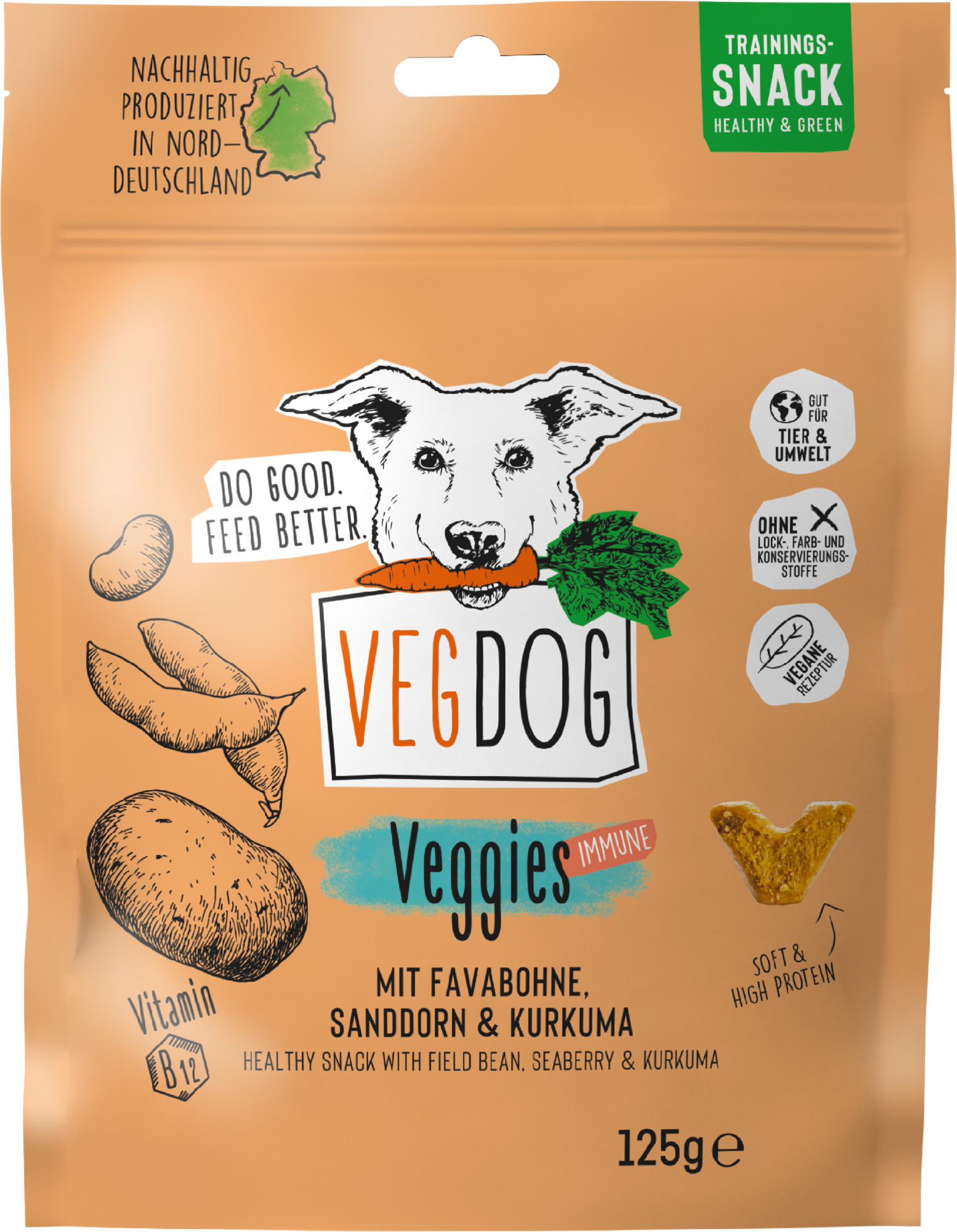 Les friandises ne doivent pas nécessairement avoir un goût de viande pour être délicieuses ! Les Veggies immune de VEGDOG sont de savoureuses friandises véganes à la recette hypoallergénique, qui conviennent parfaitement aux animaux souffrant d'allergies alimentaires. Le mélange d'argousier acide et de curcuma épicé en font une expérience gustative unique, en plus d'offrir une portion supplémentaire de vitamine C. Irrésistible au goût et léger pour l'estomac !
