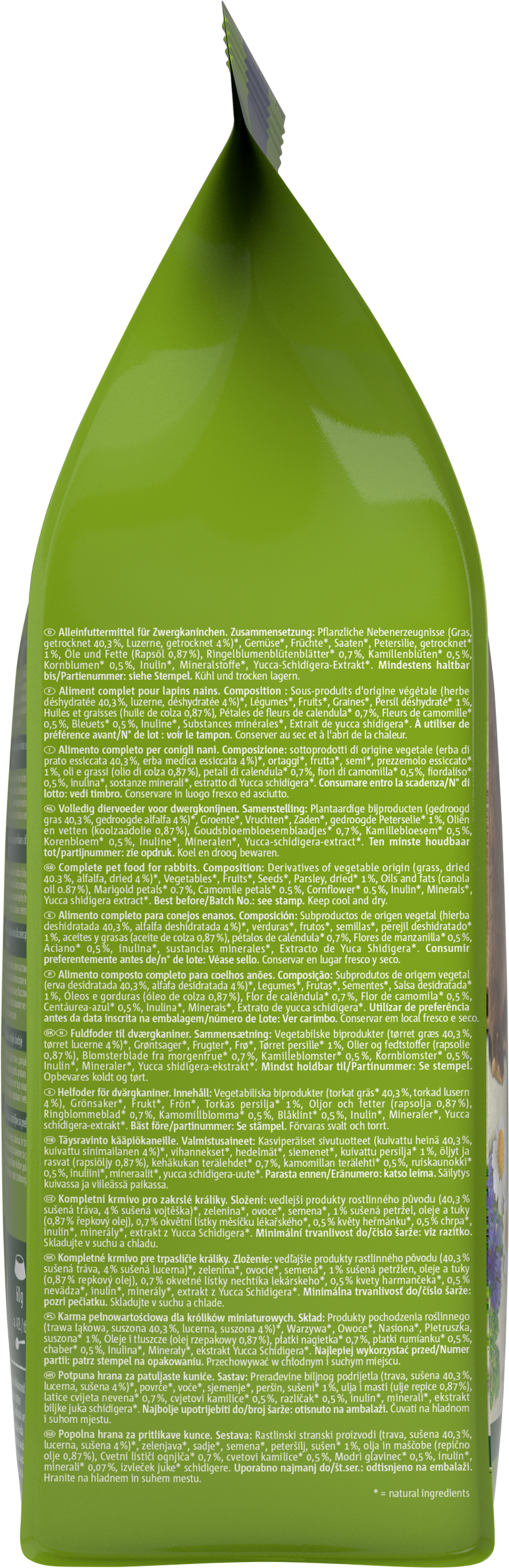 Cette nourriture complète de qualité contient tout ce qui doit figurer au menu d’un lapin nain et contribue, grâce à sa formulation équilibrée et adaptée à l’espèce, à une vie pleine de vitalité pour vos petits compagnons. Sa composition sans grains, son, ni farine de céréales la rend également adaptée aux lapins nains à la sensibilité nutritionnelle. Vous avez ainsi l’assurance d’un apport nutritionnel optimal.