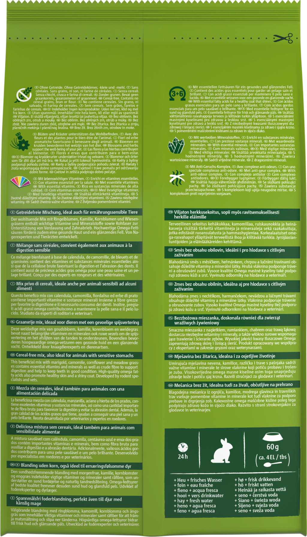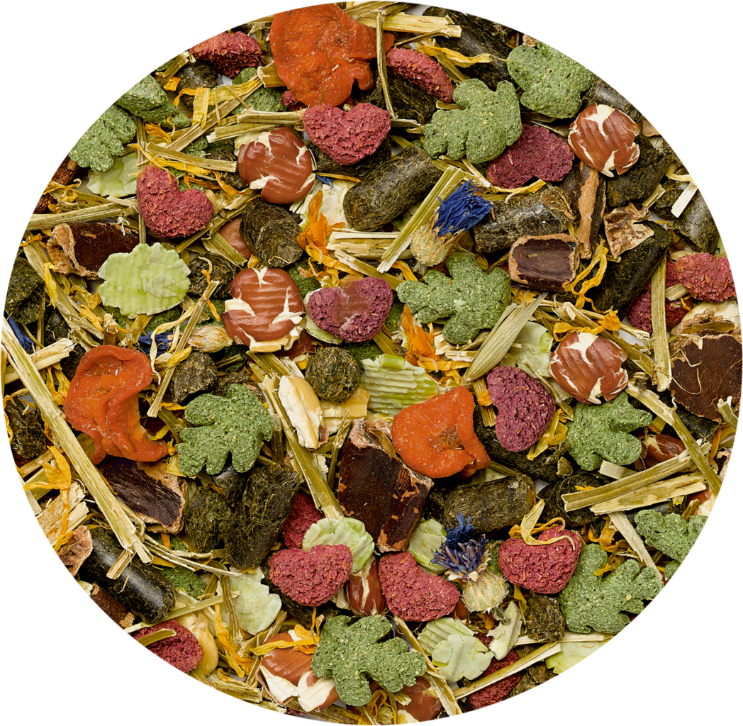 sous-produits végétaux (40,2 % graminées des prés), légumes, fruits, graines, 1 % persil séché, huiles et graisses (0,87 % huile de colza), 0,7 % Ringelblumenblütenblätter, 0,5 % bleuets, 0,5 % fleurs de camomille, inuline, Mineralstoffe, extrait de Yucca schidigera
