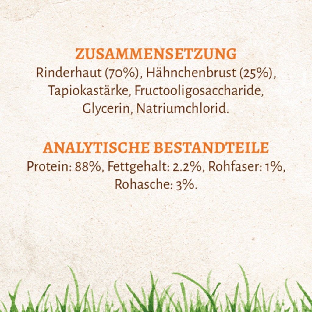 70 % ongelooide huid, 25 % kipfilet, tapiocazetmeel, fructo-oligosachariden, glycerine, natriumchloride