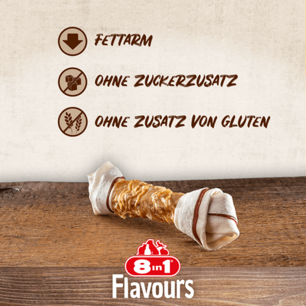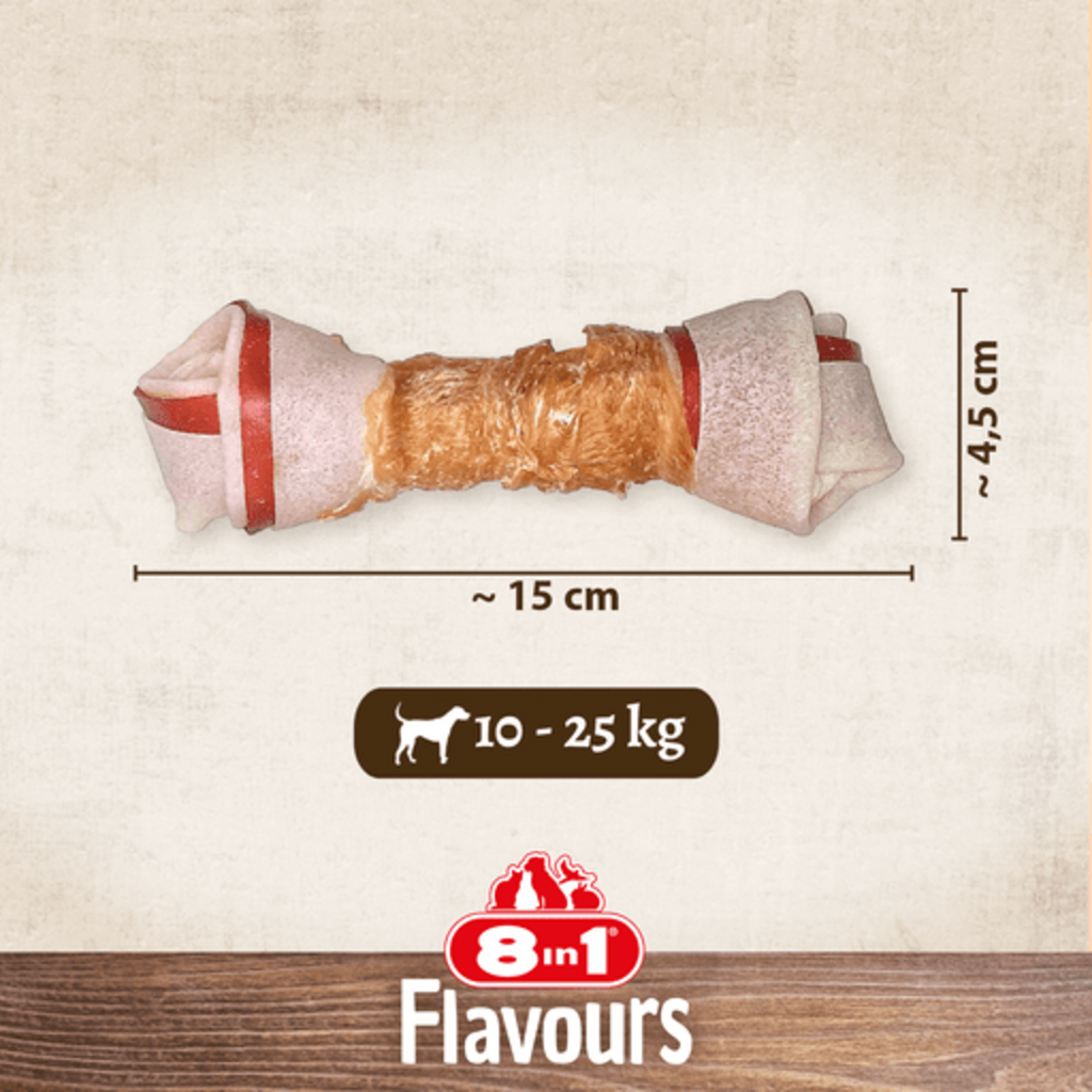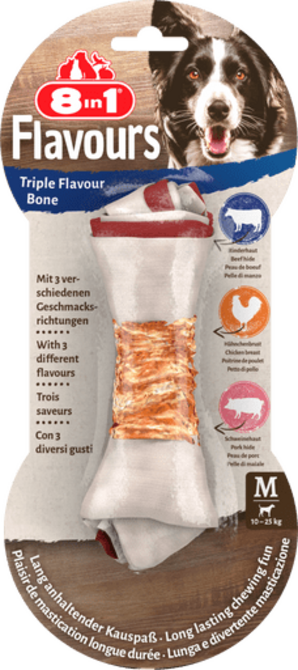 De voedingsrijke Triple Flavour Bones van 8in1 zijn een heerlijke traktatie voor een echte smaakexplosie! Ze combineren drie uitgesproken heerlijke smaken van varkens- en runderhuid, maar zijn omhuld met mals, sappig kipfilet.