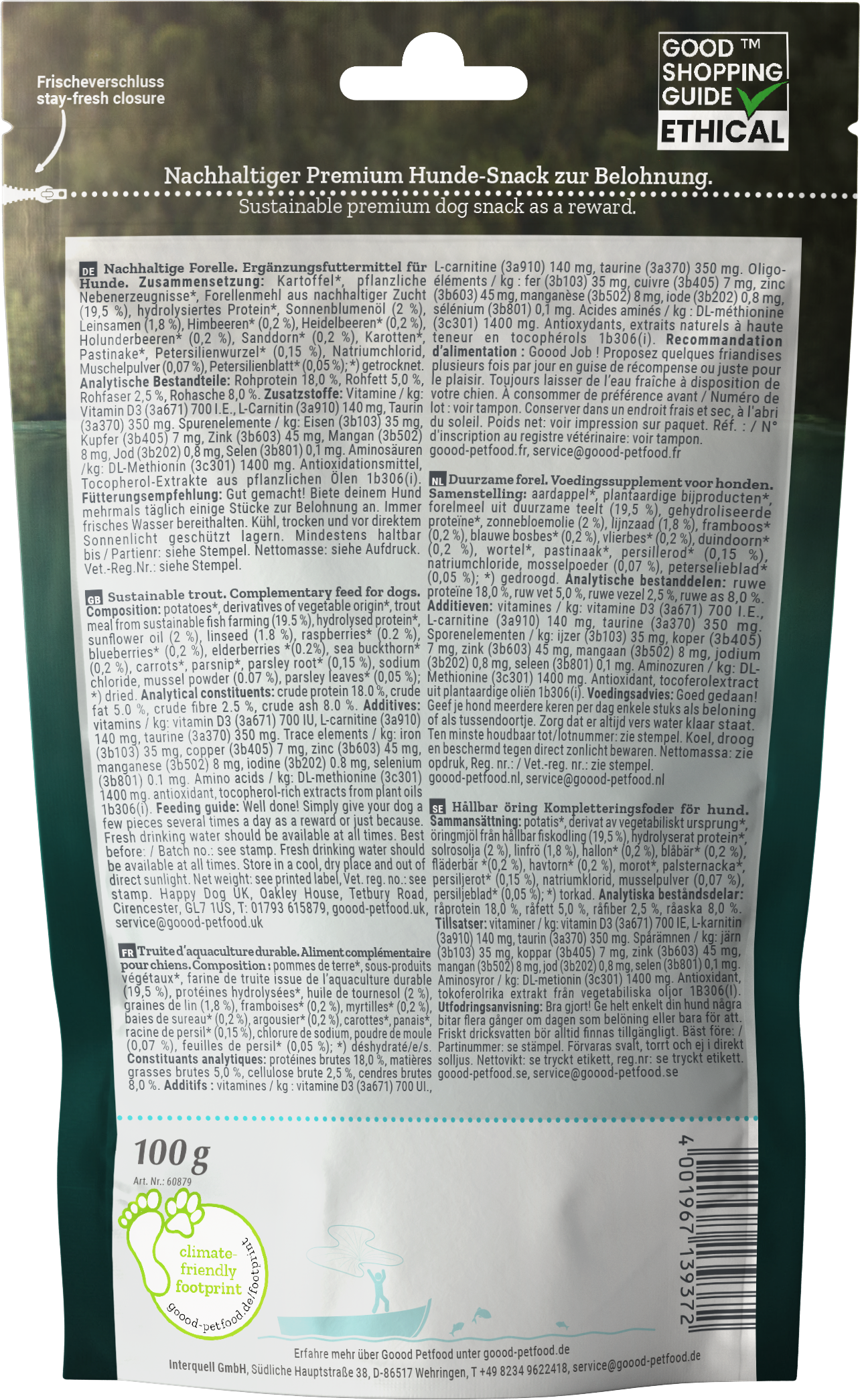 In deze premium hondensnack zitten uitsluitend zorgvuldig geselecteerde ingrediënten, zoals forel uit duurzame aquacultuur en aardappelen, wortelen en pastinaak uit de regio. En dat is niet alleen bijzonder lekker, maar ook een waardevolle aanvulling op het dagelijkse menu van je trouwe viervoeter.