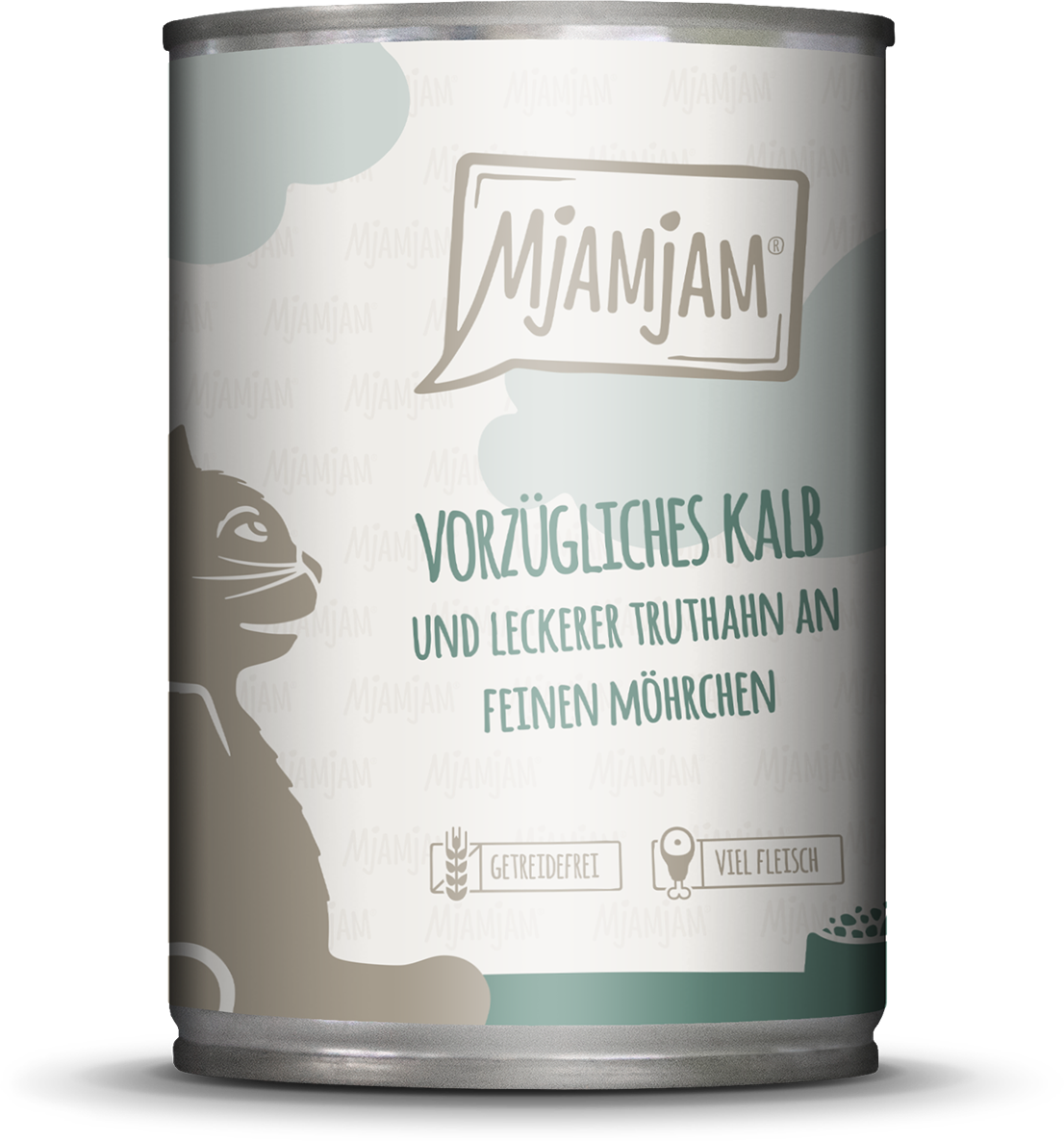 Het natvoer van Mjamjam verwent je kat met een rijke smaak, onvergelijkbare kwaliteit en een snufje liefde. Een gezonde maaltijd van hartig kalfsvlees, lekkere kalkoensvlees en frisse wortels wacht op je tijger. Zodat het je lieveling aan niets ontbreekt.