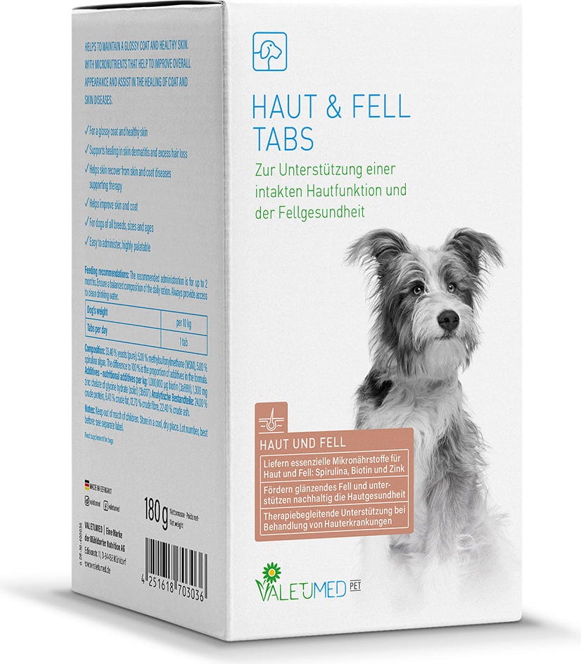 De Huid & Vacht Tabletten van Valetumed voorzien je hond van essentiële micronutriënten voor dagelijkse ondersteuning. Huid en vacht geven vaak een eerste indruk van de algemene gezondheid van je dier. Een doffe of ruwe vacht kan bijvoorbeeld wijzen op een onevenwichtige voeding.