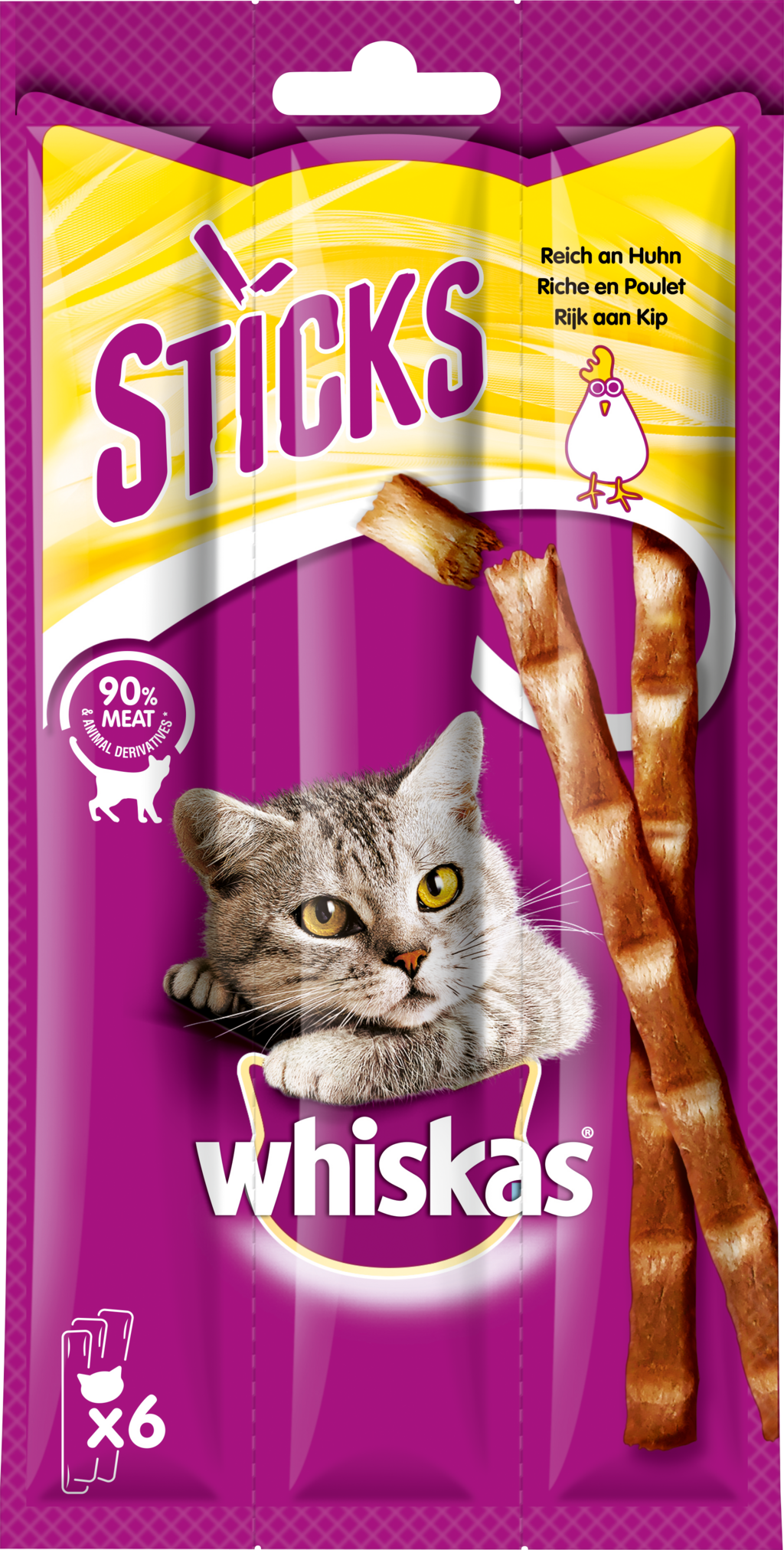 Whiskassticks zijn heerlijke snacks zonder kleur- of smaakstoffen. Deze smakelijke tussendoortjes bevatten een hoog gehalte aan omega-3-vetzuren, die een positief effect hebben op het lichaam en het immuunsysteem van je kat.