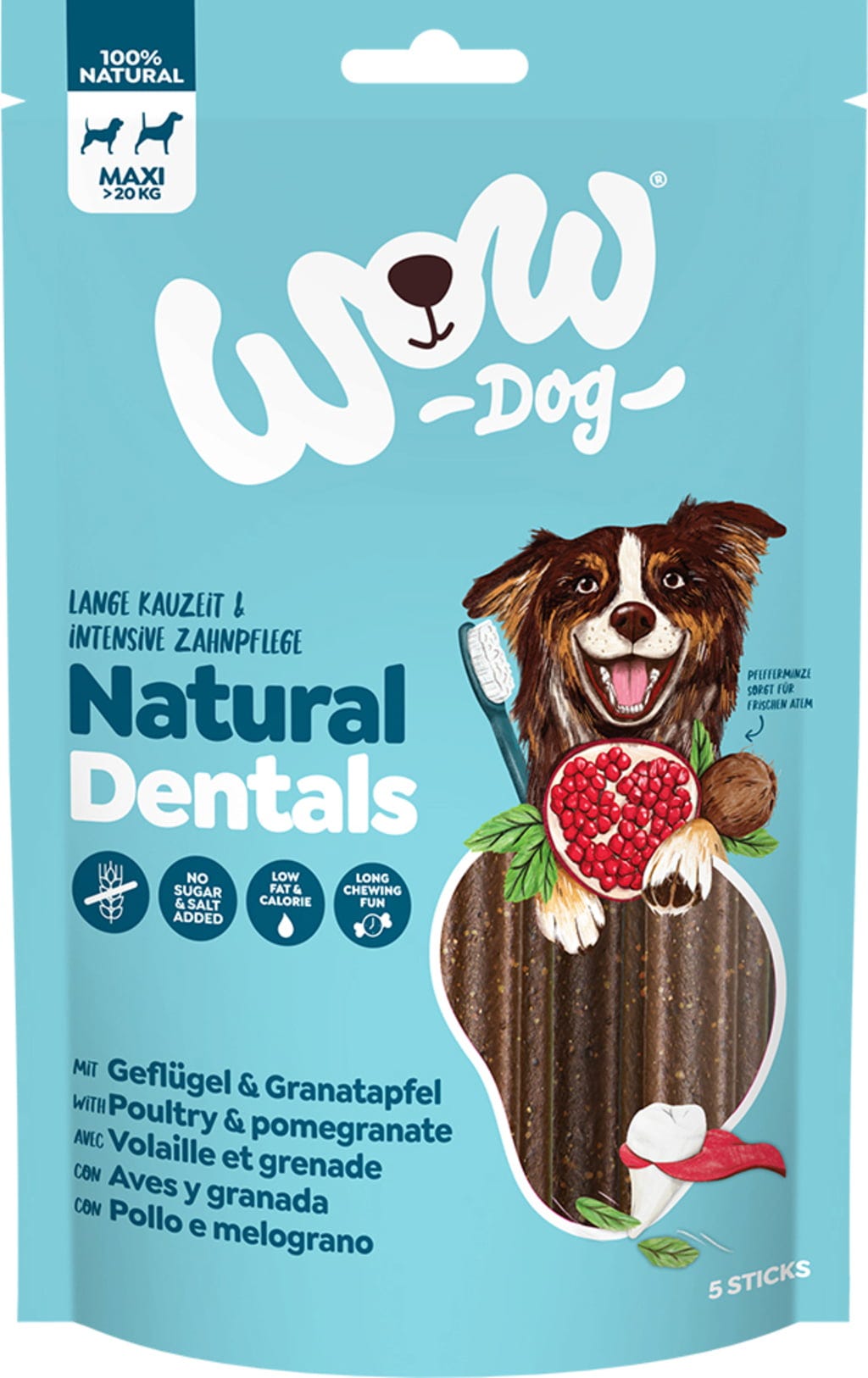 De WOW Natural Dentals met gevogelte, granaatappel & kokosolie Maxi zijn een ideale beloningssnack met een lange kauwtijd. Hun recept is vrij van granen, toegevoegde suiker en zout. Het recept bevat ook verse pepermuntolie.